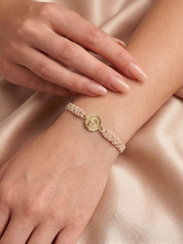 Este exquisito aplique, elaborado en oro amarillo de 18 kilates, es la definición de lujo personalizado. Su diseño circular presenta una inicial «B» en elegante relieve, enmarcada por un delicado fondo texturizado que captura la luz desde cualquier ángulo, garantizando un brillo incomparable.