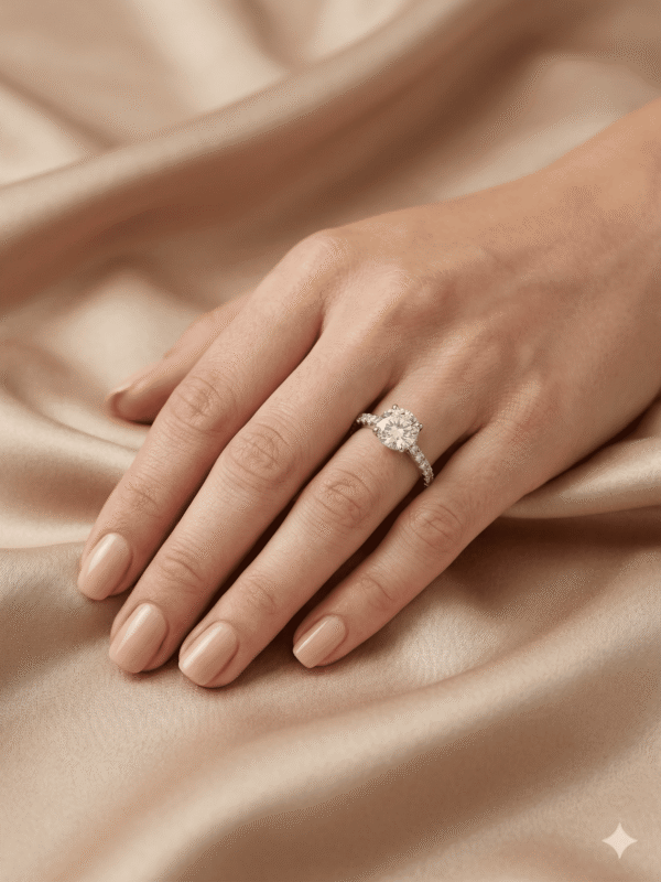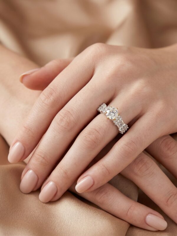 La armonía perfecta entre el brillo y el diseño. Este anillo destaca por su corona de diamantes que abraza la piedra central, complementada por una banda lateral que añade profundidad y luz extra. Una joya creada para destacar con sutileza y lujo.