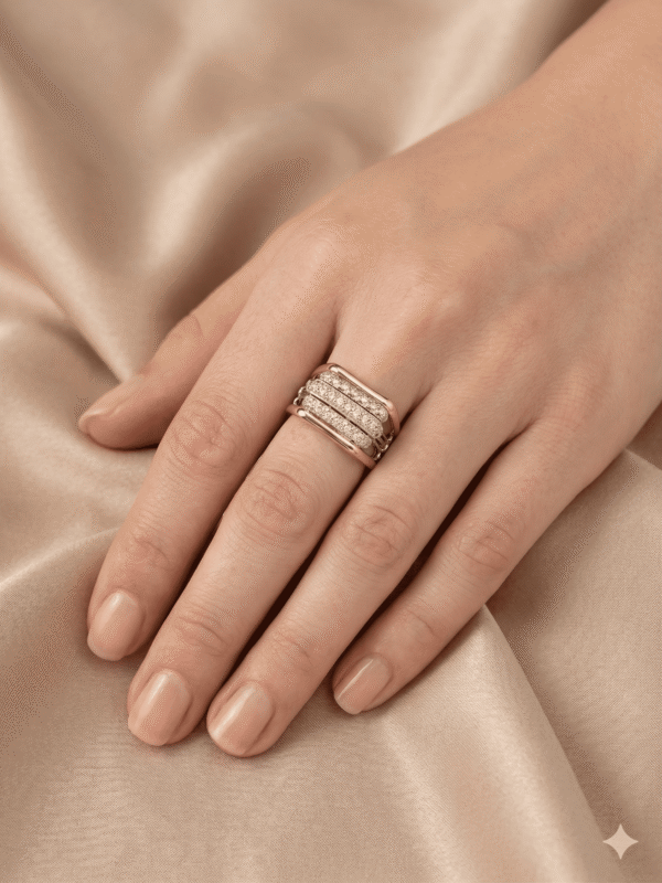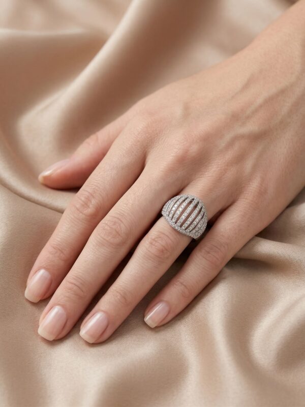 Este majestuoso anillo, elaborado en oro blanco, presenta un diseño arquitectónico único de líneas paralelas que se elevan con gracia sobre el dedo. Cada línea está meticulosamente engastada con diamantes de talla brillante, seleccionados por su excepcional fuego y pureza, garantizando un destello hipnotizante desde cualquier ángulo. El pulido de alta gama del oro blanco realza la blancura de las gemas, creando una armonía perfecta de luz y metal.