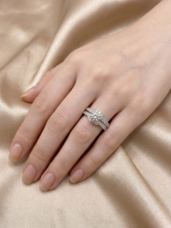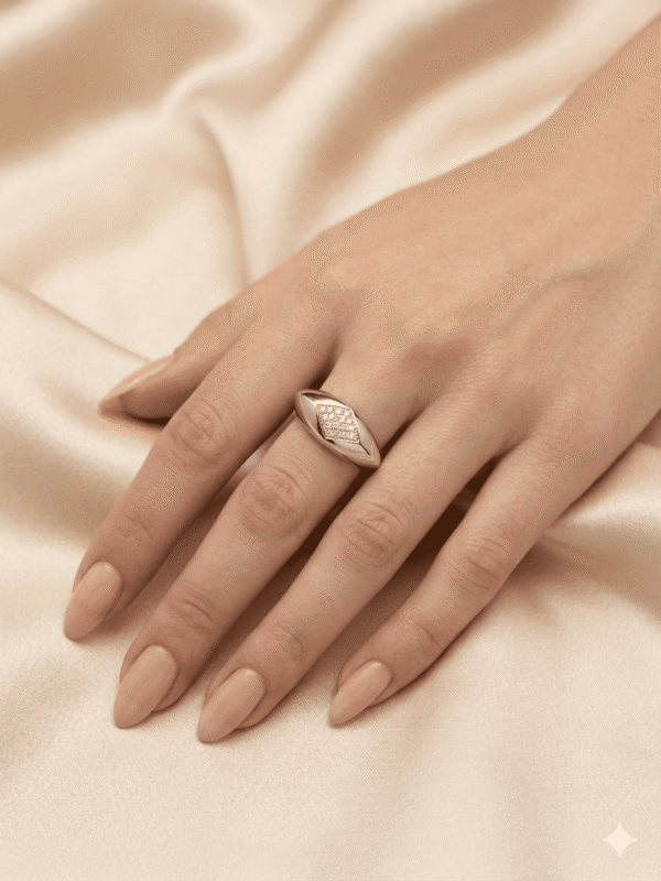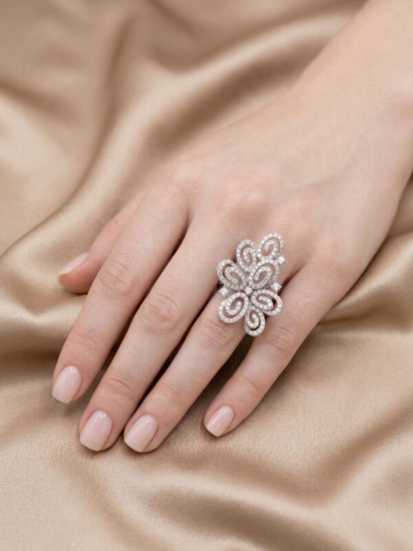 La Danza de la Luz. Inspirado en la delicadeza de la naturaleza y el brillo de las estrellas. Este anillo no es solo un accesorio; es una obra de arte que captura la luz desde cada ángulo gracias a su pavé de diamantes sobre curvas de oro blanco. Diseñado para la mujer que busca destacar con distinción y gracia.