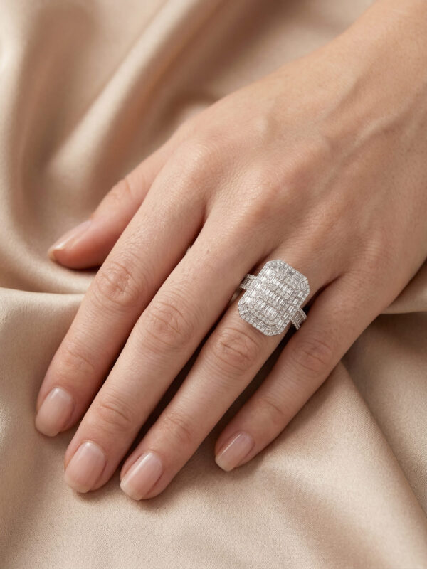 Este espectacular anillo de oro blanco de 18k es una verdadera obra de arte de la alta joyería, diseñado para quienes buscan una pieza que capture todas las miradas. Una exquisita combinación de diamantes de corte baguette en el centro, rodeados por un halo de diamantes de talla brillante que maximizan el destello desde cualquier perspectiva. Una pieza que trasciende el tiempo, diseñada para brillar tanto como tú.