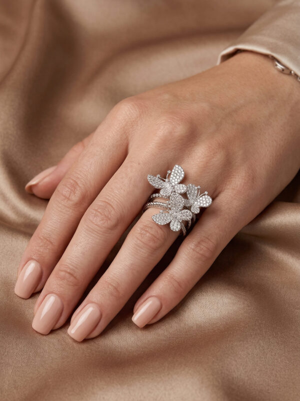 Eleve su estilo con esta pieza maestra de alta joyería. Este cautivador anillo, elaborado en oro blanco de 18 quilates, captura la gracia efímera de la naturaleza a través de un diseño de tres mariposas en pleno vuelo, meticulosamente dispuestas para crear un efecto de movimiento y luz tridimensional.