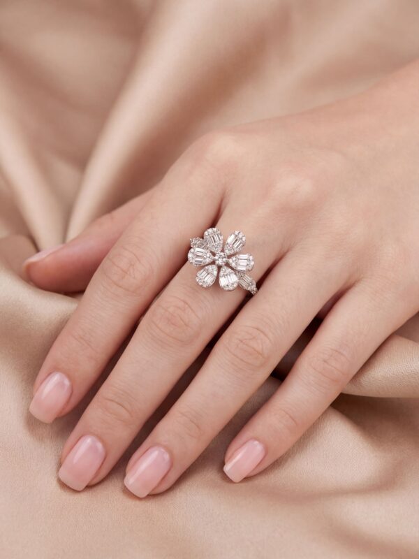 Esta exquisita joya es una celebración de la naturaleza y la feminidad. Diseñado como una flor en perpetua floración, este anillo de oro blanco combina una estructura delicada con un impacto visual radiante, ideal para quienes buscan una pieza romántica y sofisticada a la vez. Cada uno de los seis pétalos está magistralmente engastado con diamantes de corte baguette en su centro, rodeados por un halo de diamantes de corte brillante que definen su contorno y maximizan el destello. La disposición de las piedras crea un efecto tridimensional que permite que la luz penetre desde múltiples ángulos, garantizando un brillo excepcional en cada movimiento.