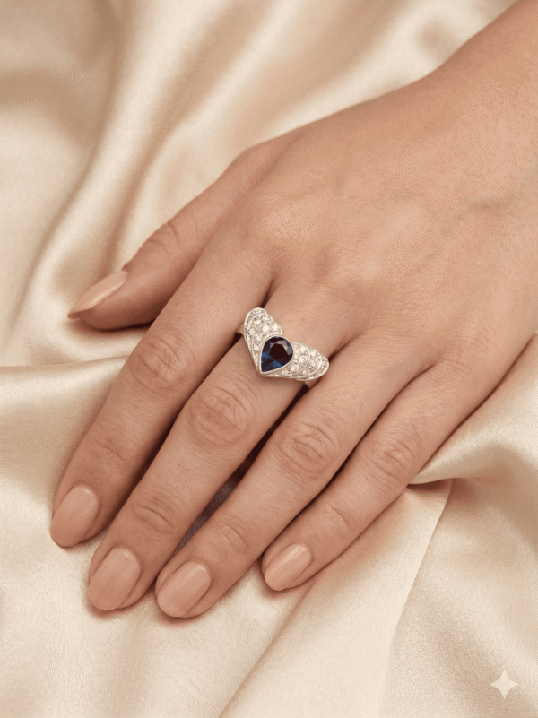 Anillo en oro blanco que roba miradas: un elegante zafiro corte pera en tono profundo se convierte en el protagonista, rodeado de brillantes naturales que realzan su luz con un destello sofisticado.