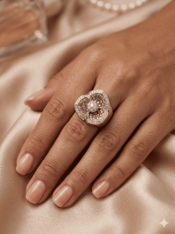 Este exclusivo anillo captura la esencia de una flor en pleno esplendor. Elaborado en oro blanco de 18k, destaca por su exquisito contraste cromático y su arquitectura tridimensional. Un núcleo elevado de diamantes blancos en pavé y tres pétalos tapizados con diamantes de color ámbar, lo hacen una pieza sofisticada, perfecta para quienes buscan una joya que combine la distinción clásica con un toque de color vibrante.
