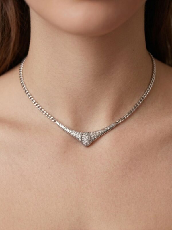 Un brillo que cuenta una historia. Captura la luz y las miradas con esta pieza magistral. Los finos eslabones de oro blanco sostienen un aplique central cuajado de diamantes, diseñado para resaltar la belleza natural del cuello. Más que una joya, es una declaración de estilo que trasciende el tiempo. Un regalo inolvidable para un momento único.
