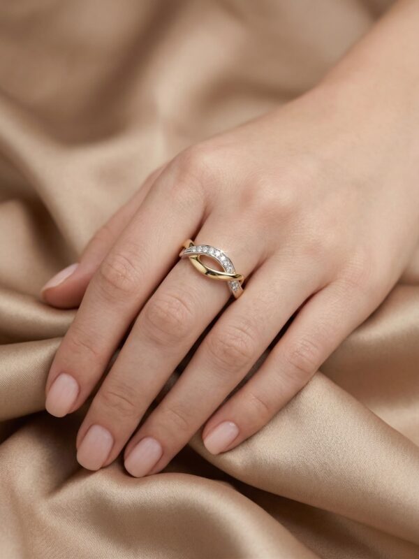 Este cautivador anillo de dos tonos en oro amarillo y blanco presenta un diseño entrelazado moderno y fluido. Una hilera deslumbrante de diamantes brillantes, acentuada por un destello central, resplandece sobre la banda de oro blanco que cruza una base de oro amarillo pulido. El contraste perfecto de colores y luz crea una pieza sofisticada e inolvidable, perfecta para un símbolo de amor único y contemporáneo.