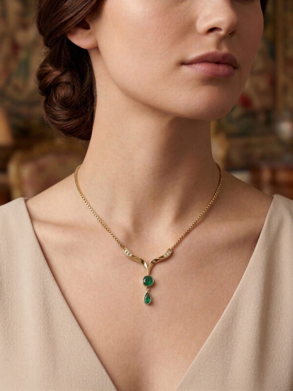 Una pieza que captura la esencia del lujo clásico. Esta exquisita gargantilla en oro amarillo de 18 quilates presenta un diseño fluido que culmina en una vibrante esmeralda central de corte redondo, seguida por una delicada gota de esmeralda en forma de pera. Los sutiles acentos de diamantes en los laterales añaden un destello de luz incomparable, convirtiéndola en el tesoro perfecto para los momentos más memorables.