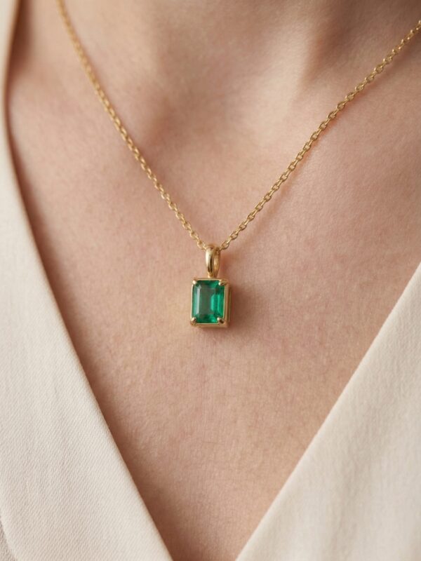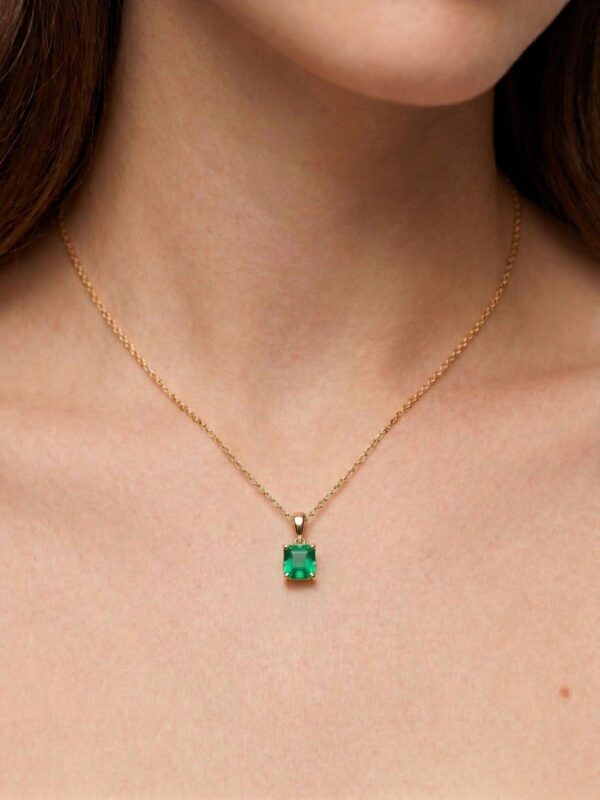 Este exquisito dije presenta una esmeralda natural de vibrante color verde, tallada en un elegante corte esmeralda que maximiza su brillo y profundidad. Engastada cuidadosamente en una montura de oro amarillo de 18k con cuatro puntas clásicas, esta joya pende de una delicada cadena que realza su distinción. Una pieza diseñada para quienes buscan un equilibrio perfecto entre la sobriedad y la opulencia.