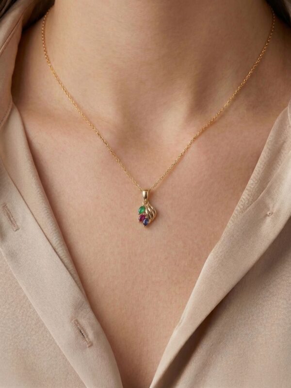 Este exquisito dije, elaborado en oro amarillo de 18 quilates, presenta un diseño orgánico inspirado en la delicadeza de la naturaleza. Su estructura de líneas fluidas abraza con maestría tres gemas preciosas en talla marquesa: una vibrante esmeralda, un apasionado rubí y un profundo zafiro. Una explosión de color equilibrada que aporta distinción a cualquier atuendo.