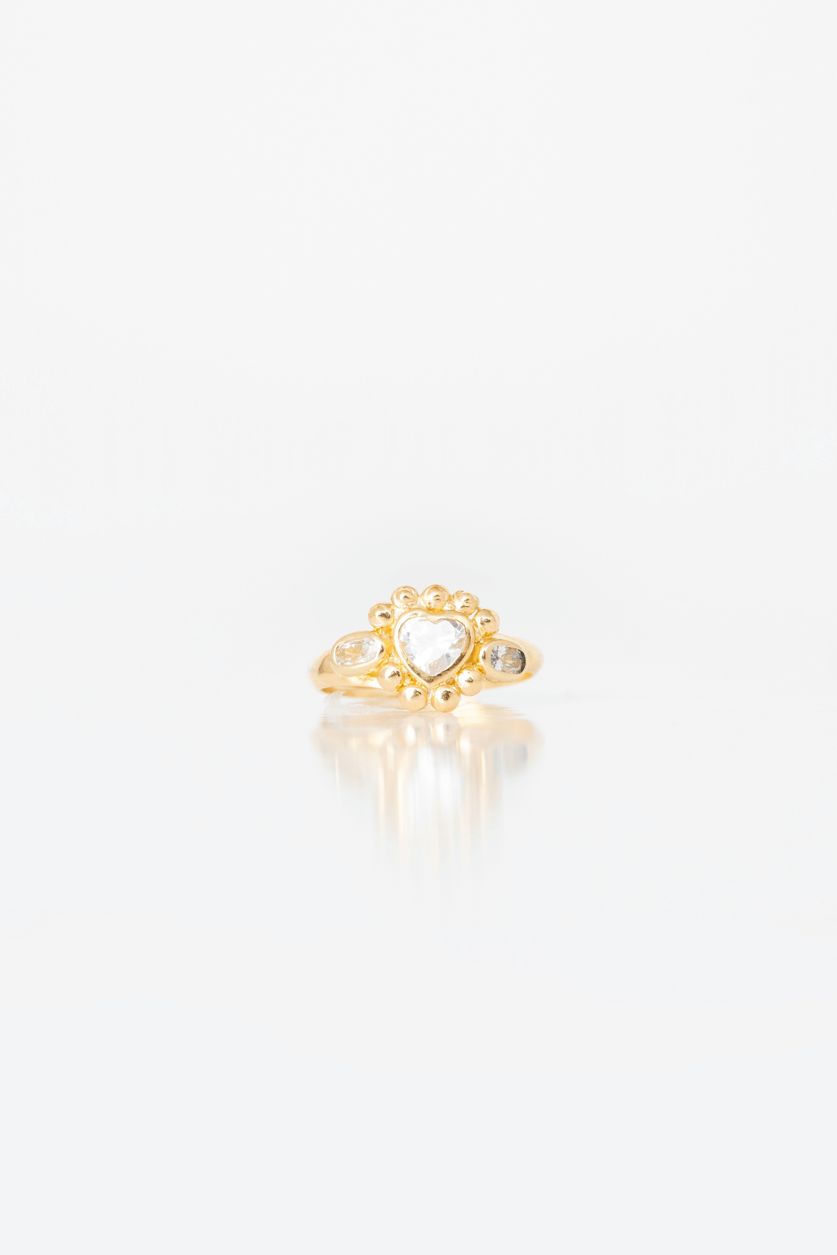 Romántico y encantador, este anillo de oro de 18 kilates celebra el amor con un diseño central en forma de corazón enmarcado por delicados detalles dorados que evocan dulzura y elegancia. Acompañado por dos circones laterales que aportan brillo y equilibrio, es la joya ideal para regalar sentimientos sinceros o simplemente consentirte con una pieza única y significativa.