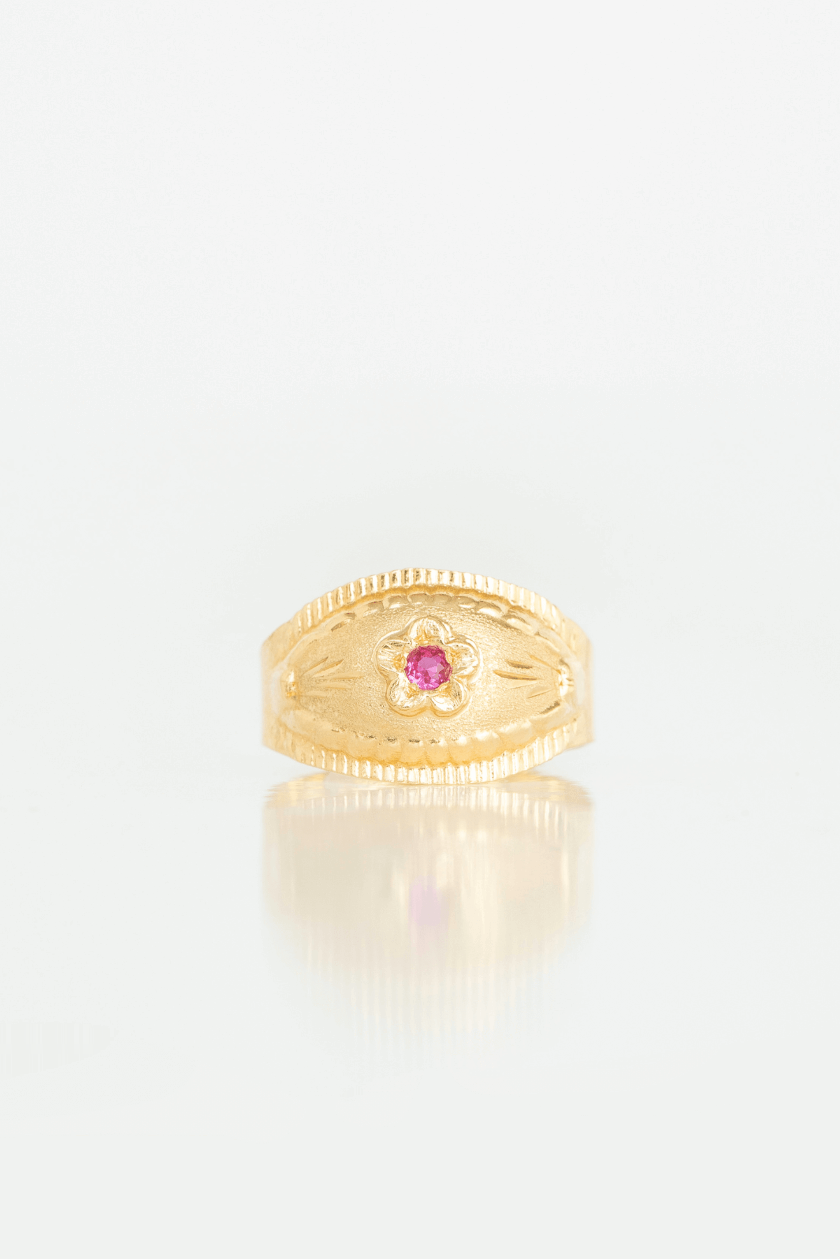 Este anillo en oro de 18 kilates es una joya que irradia carácter y elegancia. Su diseño ovalado con bordes delicadamente texturizados enmarca un circón central en tono rubí que añade un toque de color vibrante y sofisticado. Perfecto para quienes valoran los detalles clásicos con un aire de distinción, este anillo es ideal tanto para el uso diario como para ocasiones especiales.