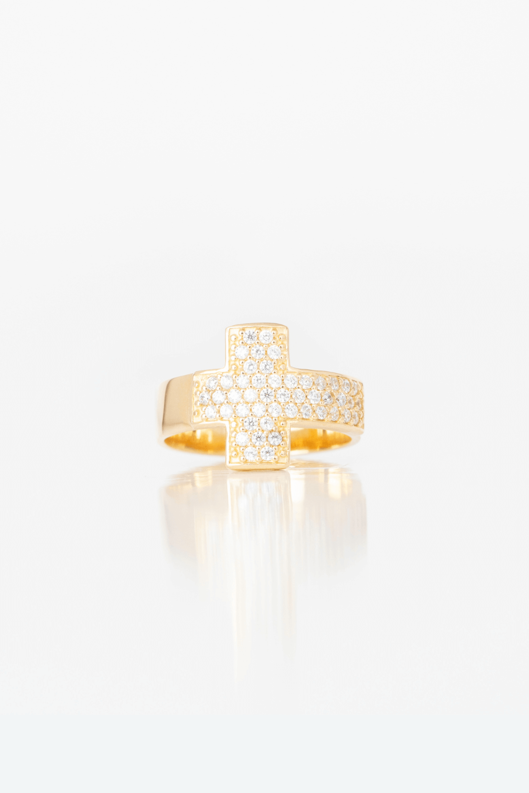 Este impactante anillo en oro amarillo de 18 kilates presenta un diseño audaz con una cruz central completamente pavé en circones, que resalta por su brillo y definición. Su silueta firme y moderna lo convierte en una joya de carácter, perfecta para quienes desean llevar consigo un símbolo espiritual con elegancia y distinción.