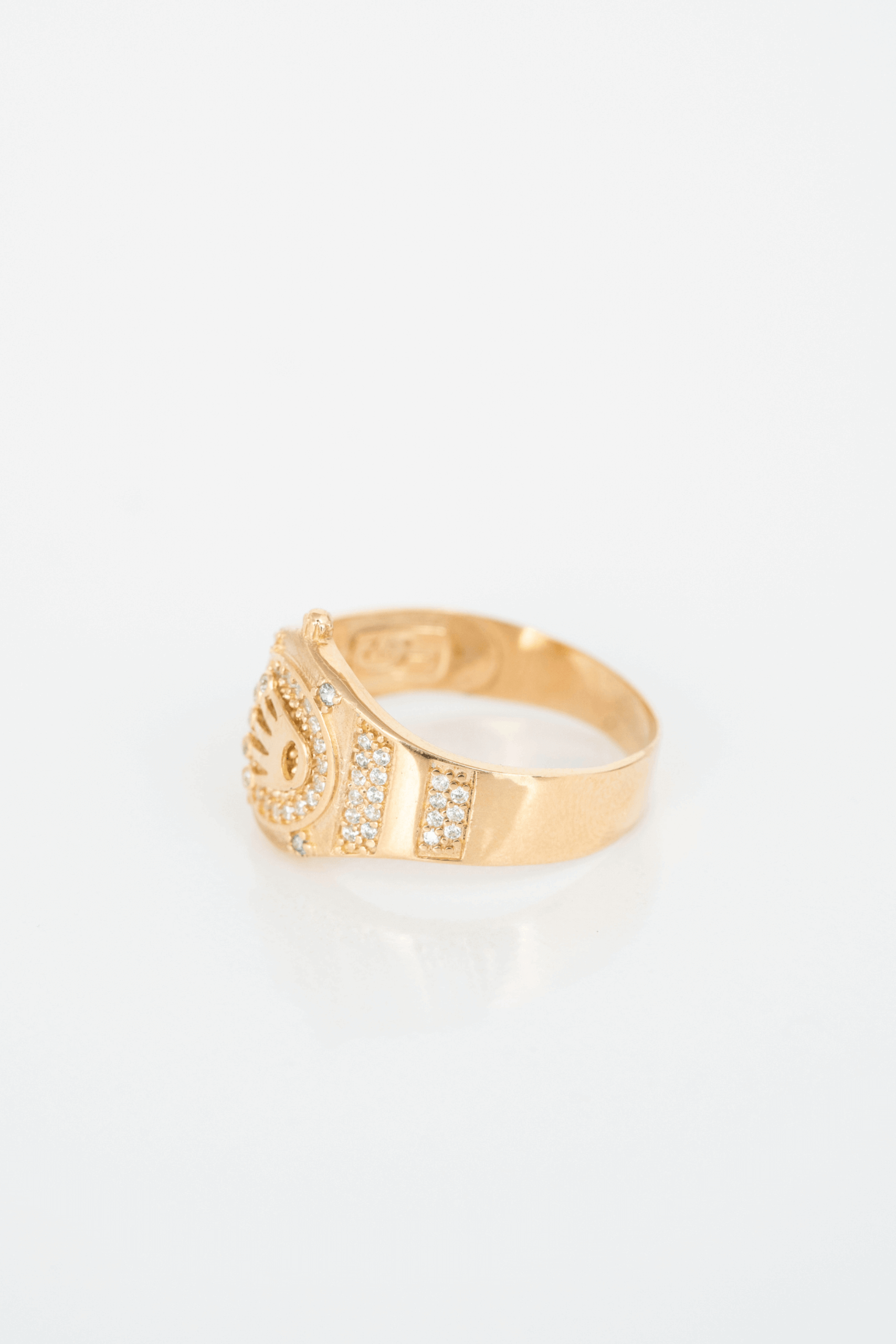 Este impresionante anillo en oro de 18 kilates destaca por su diseño audaz y elegante. La parte frontal luce un distintivo símbolo de corona, enmarcado por una aureola de brillantes circones que le aportan un destello lujoso desde todos los ángulos. A cada lado de la argolla, una fila de piedras completa la estética majestuosa de la pieza, reflejando poder y sofisticación. Ideal para quienes desean portar una joya con carácter y presencia, este anillo es un verdadero emblema de realeza y distinción.