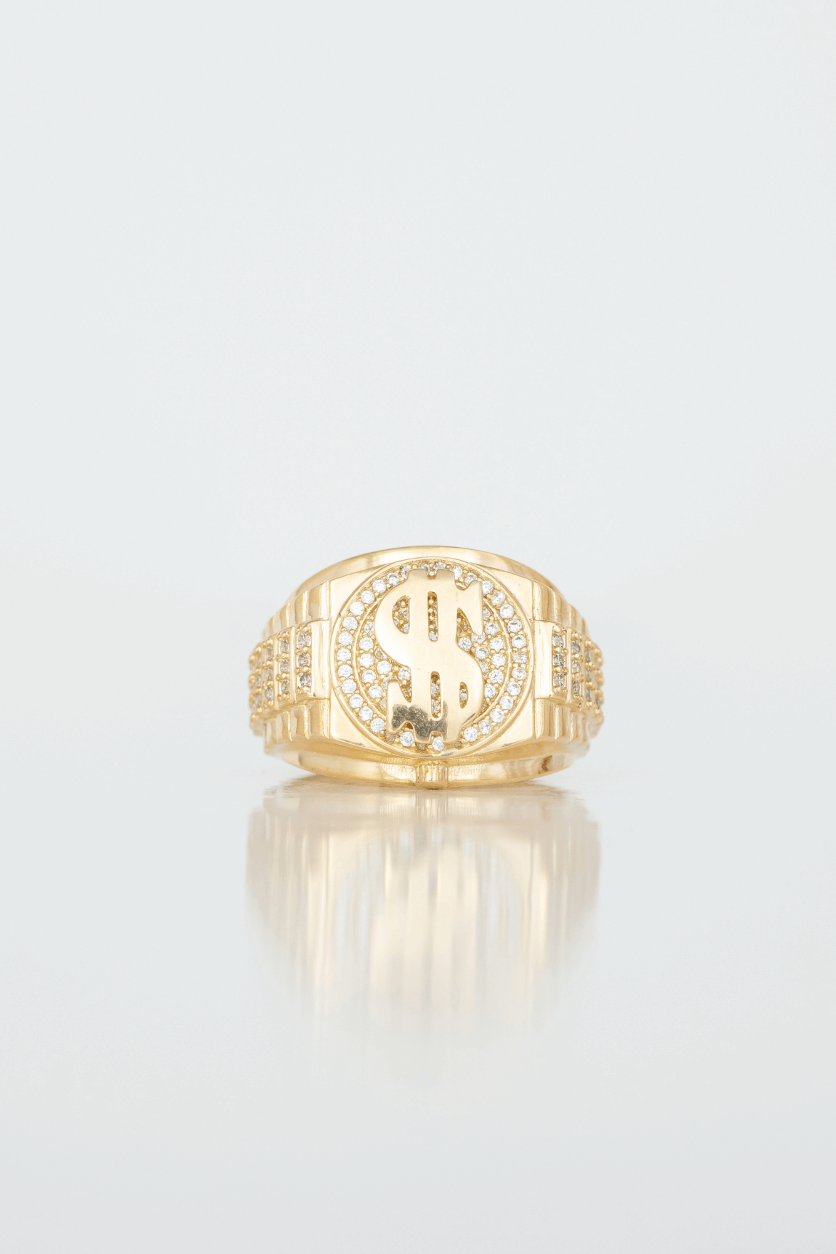 Este anillo en oro de 18 kilates es una audaz representación de poder y éxito financiero. Su diseño central exhibe con orgullo el símbolo del dólar ($), realzado por un resplandeciente fondo de circones que lo hace brillar desde todos los ángulos. La banda lateral, también engastada con brillantes circones, aporta volumen y carácter a esta joya imponente. Ideal para quienes desean reflejar una actitud segura, ambiciosa y con visión de abundancia, esta pieza combina lujo moderno con una estética llamativa y decidida.