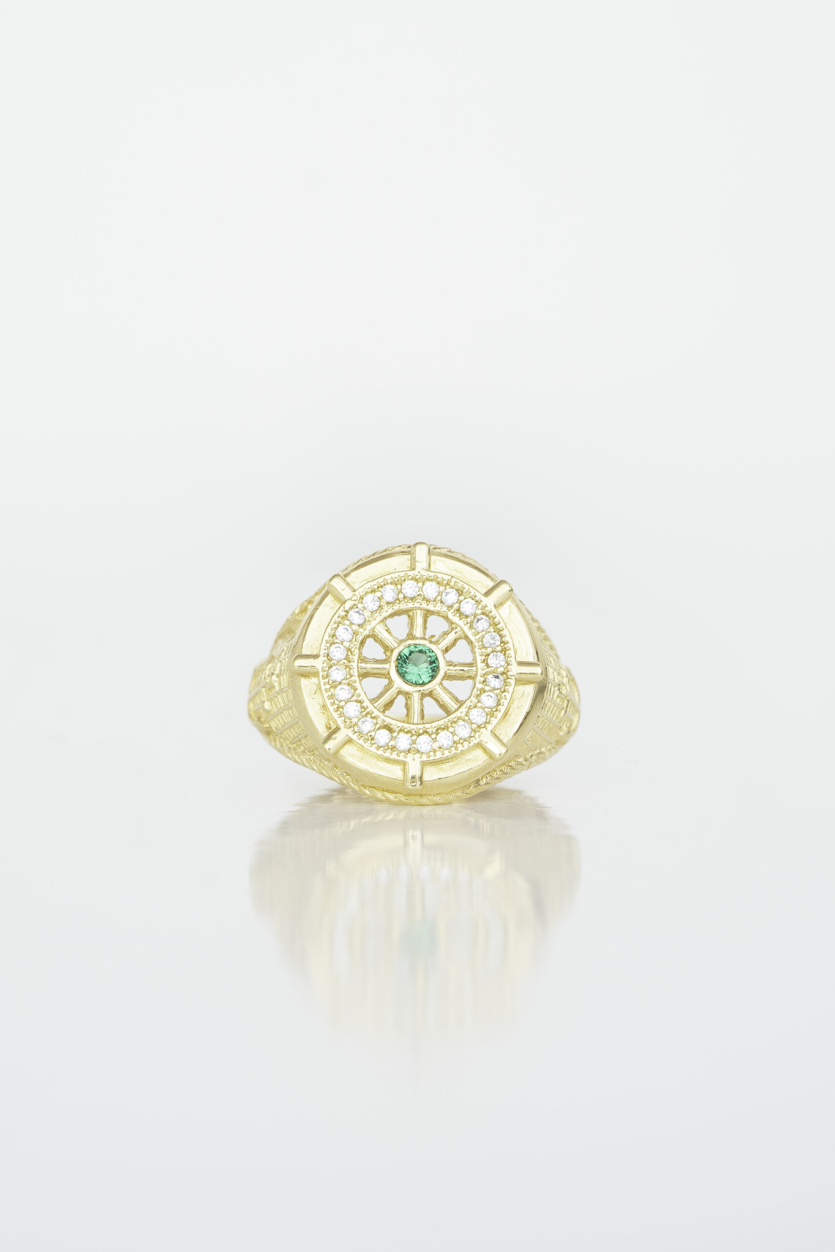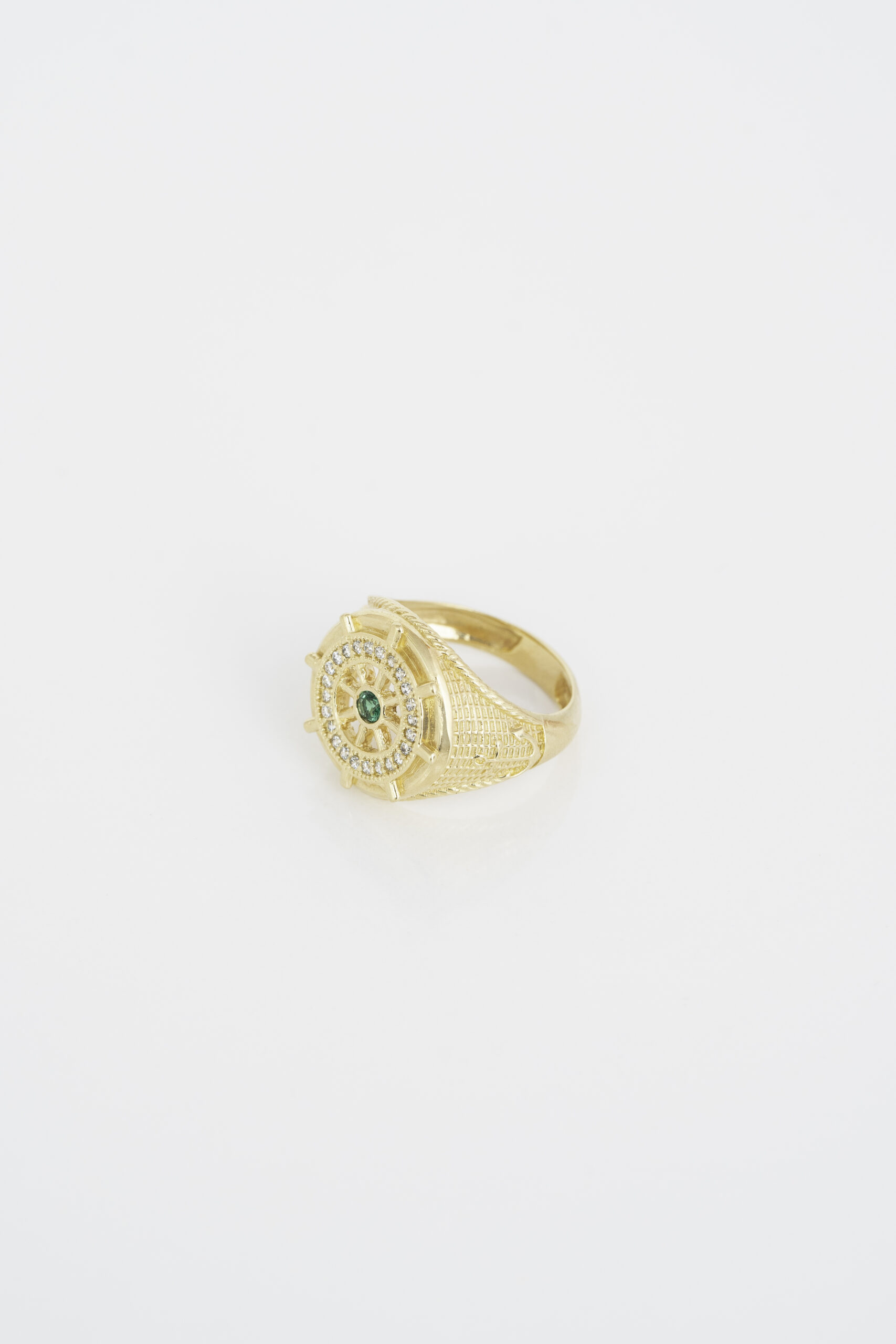 Anillo Nautilus en oro de 18 kilates, una joya que evoca el espíritu aventurero y la fuerza del liderazgo. Su diseño central en forma de timón náutico está exquisitamente realzado con una piedra central verde tipo esmeralda, rodeada por un círculo de brillantes circones blancos que aportan luz y distinción. El cuerpo del anillo presenta un acabado texturizado tipo rejilla con relieves decorativos que completan esta pieza única, ideal para quienes navegan con determinación por la vida.