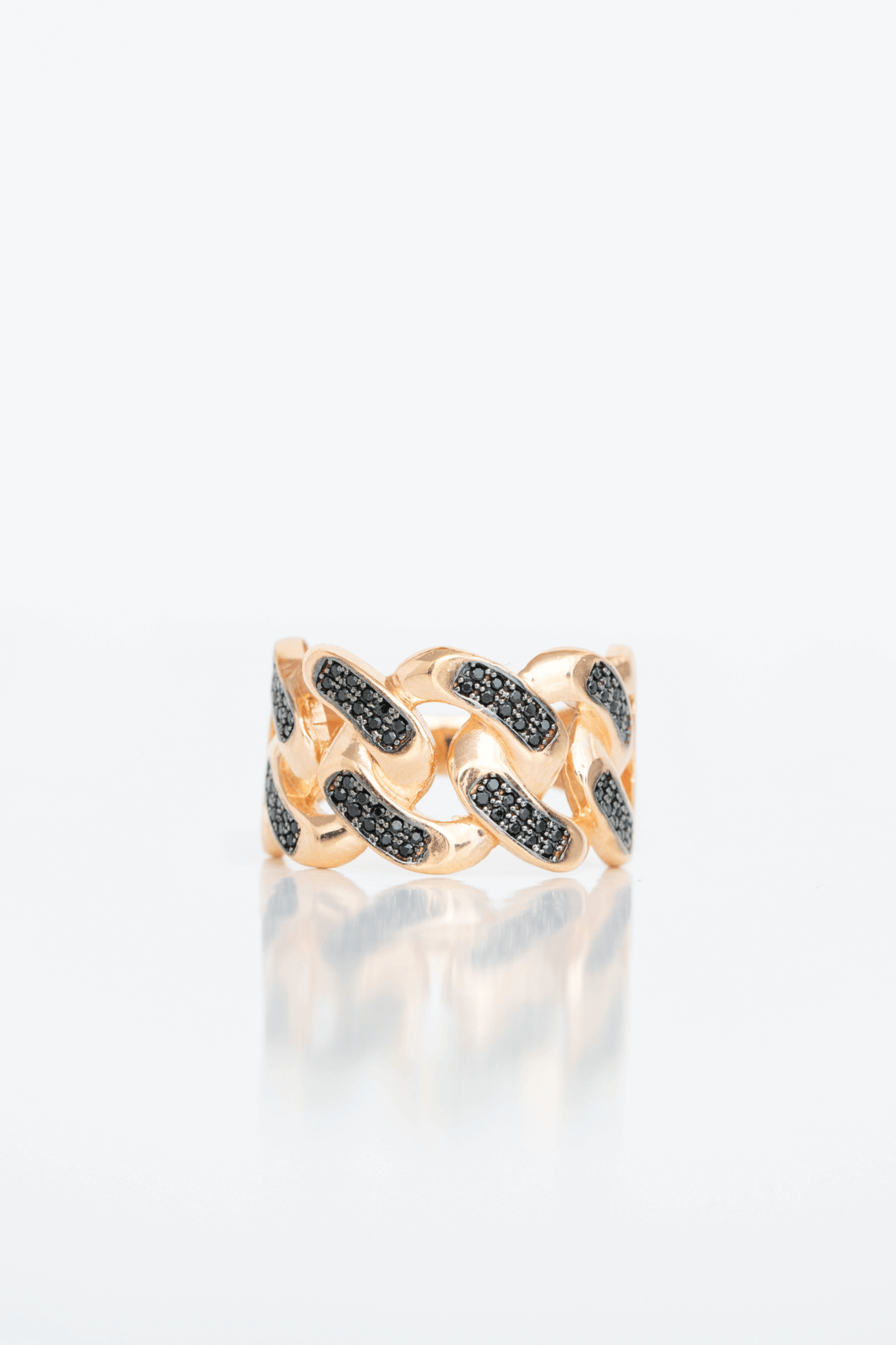 Imponente y sofisticado, este anillo está elaborado en oro rosa de 18 kilates con un diseño entrelazado tipo cadena que evoca fuerza y elegancia. Cada eslabón está cuidadosamente engastado con circones negros que aportan un contraste audaz y moderno. Una joya que combina a la perfección lujo y estilo urbano, ideal para quienes buscan destacar con distinción y carácter.