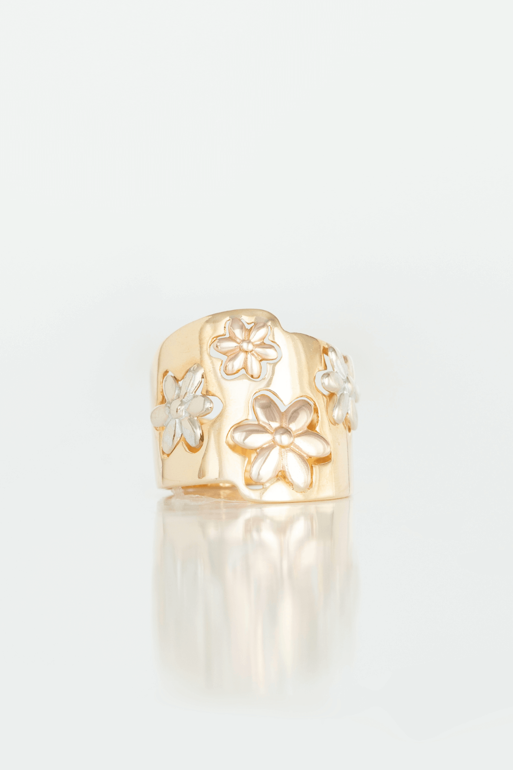 Este encantador anillo en oro italiano es una joya que evoca frescura y feminidad. Su diseño ancho y brillante resalta delicadas flores en tonos mate y brillo, creando un hermoso contraste visual. Ideal para mujeres que aman los detalles naturales con un toque sofisticado, este anillo es perfecto para resaltar cualquier look con elegancia y alegría floral.