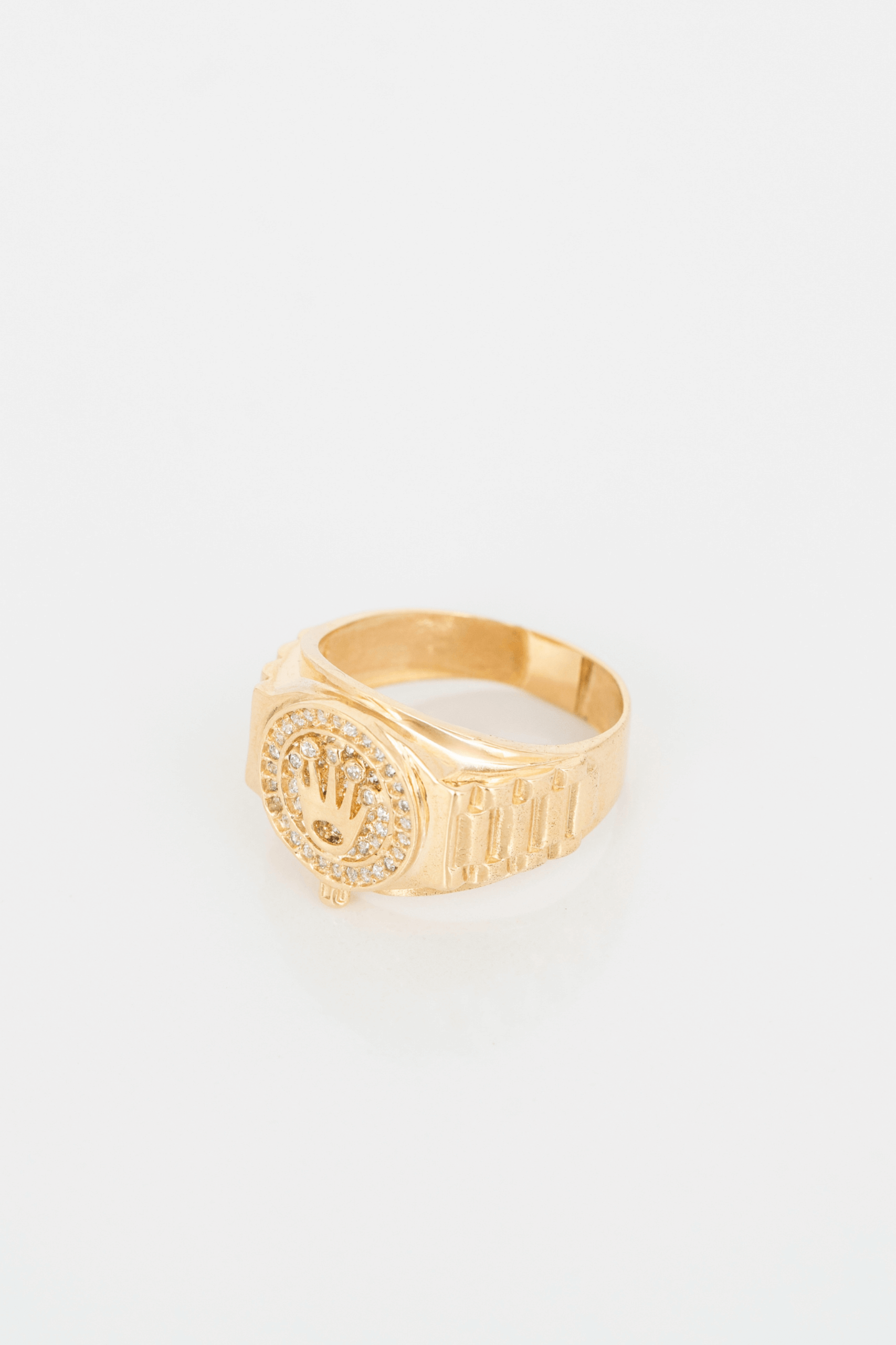 Este imponente anillo de oro de 18 kilates irradia lujo y poder. Su diseño presenta un distintivo emblema de corona en relieve al centro, rodeado por un marco circular de finos circones que realzan su brillo. Los laterales están adornados con un patrón tipo brazalete, que aporta textura y carácter, evocando el estilo de los relojes de alta gama. Perfecto para quienes desean una pieza que refleje liderazgo, elegancia y exclusividad en cada detalle.
