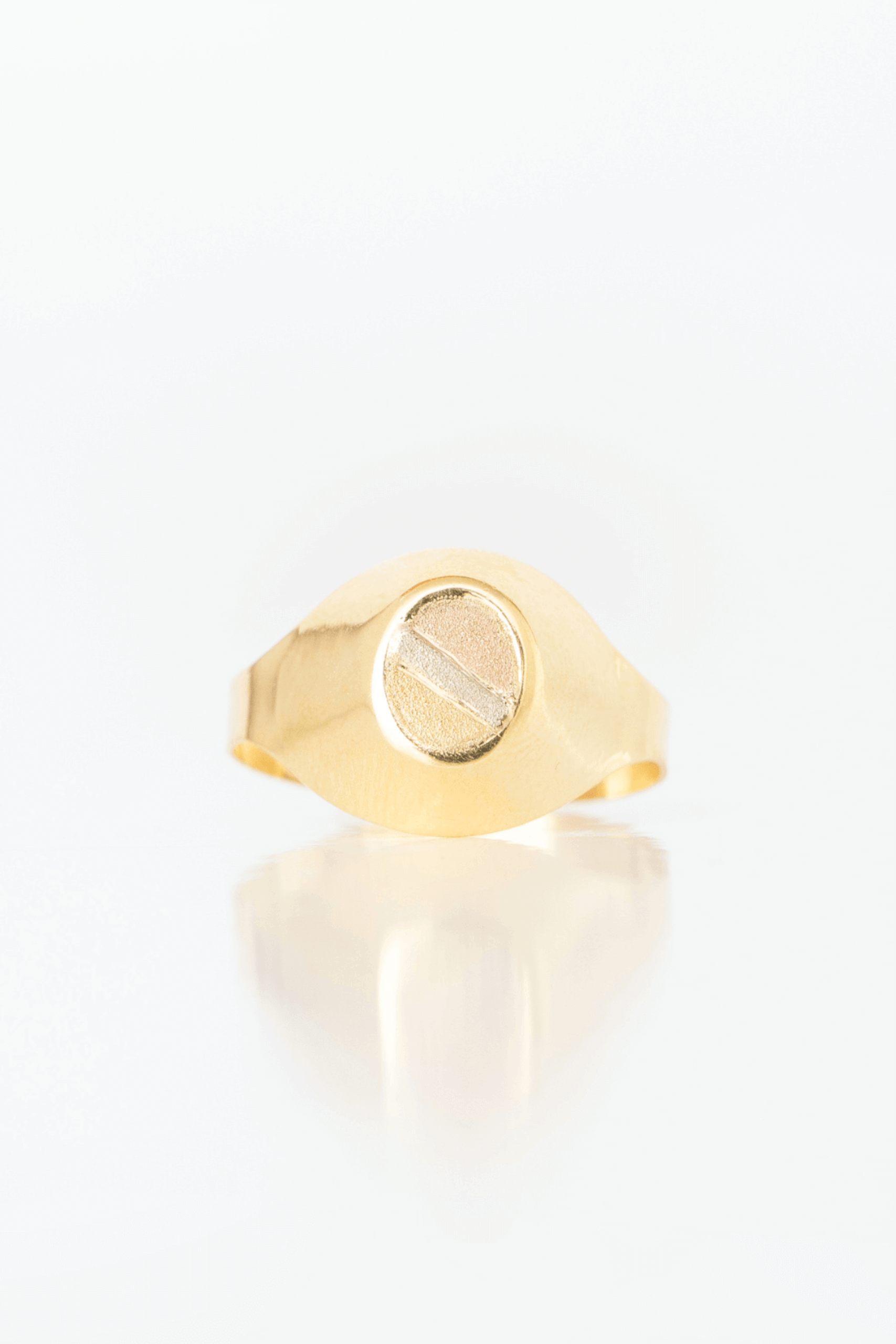 Este anillo de oro sólido de 18 kilates destaca por su diseño limpio y contemporáneo. En el centro, un detalle ovalado pulido con textura satinada en los 3 oros, aporta un toque distintivo y moderno, ideal para quienes aprecian la discreción con carácter.