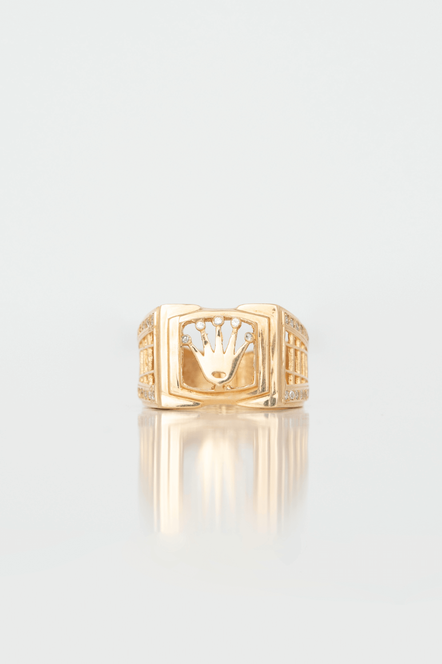 Este impactante anillo en oro de 18 kilates combina fuerza y distinción en un solo diseño. Su centro resalta con una corona en alto relieve, símbolo de autoridad y sofisticación, que se enmarca con líneas angulares y texturas que aportan carácter. El acabado pulido del oro resalta su brillo natural, mientras que los laterales decorados con detalles geométricos elevan su atractivo visual. Ideal para quienes buscan una joya con personalidad, imponente y con una estética de lujo contemporáneo.