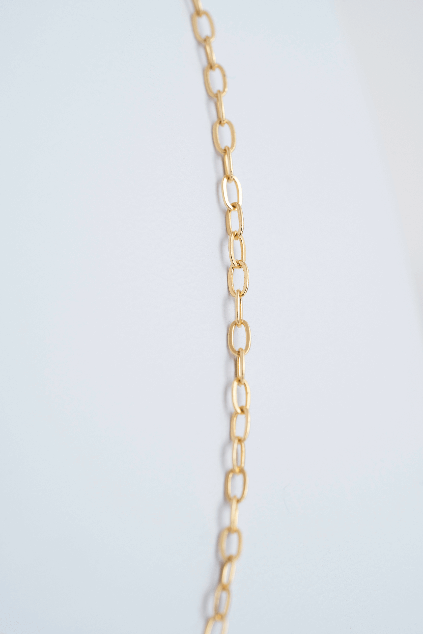 Esta cadena en oro italiano de 18 kilates destaca por su diseño de eslabones alargados, finamente pulidos para lograr un brillo elegante y sutil. Su estética ligera y moderna la convierte en una pieza versátil, ideal para llevar sola o combinar con dijes delicados. Un accesorio que equilibra simplicidad y sofisticación, perfecto para quienes valoran los detalles con carácter y buen gusto.