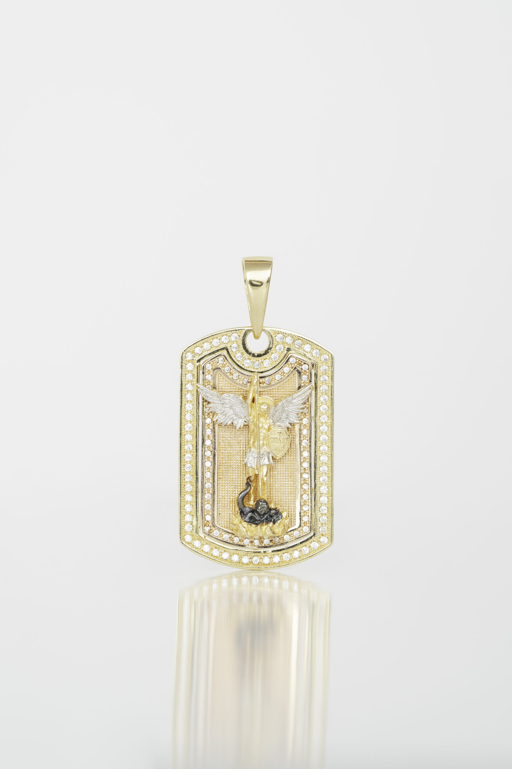 Dije de San Miguel Arcángel con incrustaciones brillantes. Una joya de protección, fe y poder espiritual. Este impresionante dije presenta al Arcángel San Miguel en actitud de victoria, empuñando su espada y derrotando al mal, mientras sostiene un escudo con la inscripción «¿Quién como Dios?». El diseño tridimensional en oro de 18 kilates, con oro plateado y negros resalta sobre una placa decorada con destellos de circonias, otorgándole una presencia majestuosa y celestial. Ideal para quienes desean llevar consigo una fuerza espiritual imponente y un símbolo de defensa divina.