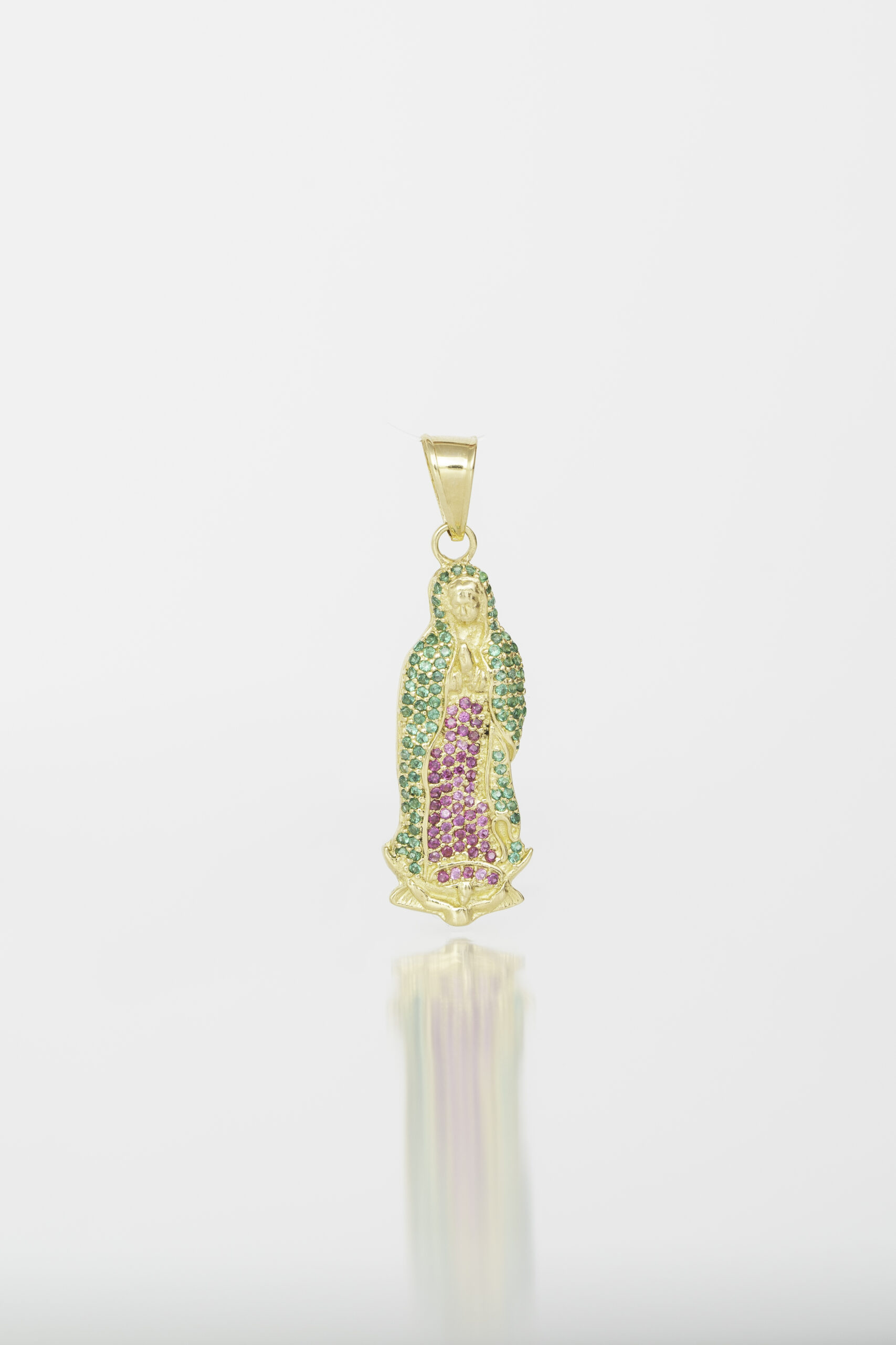 Este delicado dije de la Virgen de Guadalupe, elaborado en oro de 18 kilates, es una joya que combina espiritualidad y sofisticación. Su silueta finamente detallada está engalanada con circones en tonos fucsia y verde que evocan la tradición y los colores característicos del manto guadalupano. Su tamaño compacto lo hace ideal para uso diario o como regalo con significado profundo. Un símbolo de protección y devoción, con el resplandor eterno del oro.