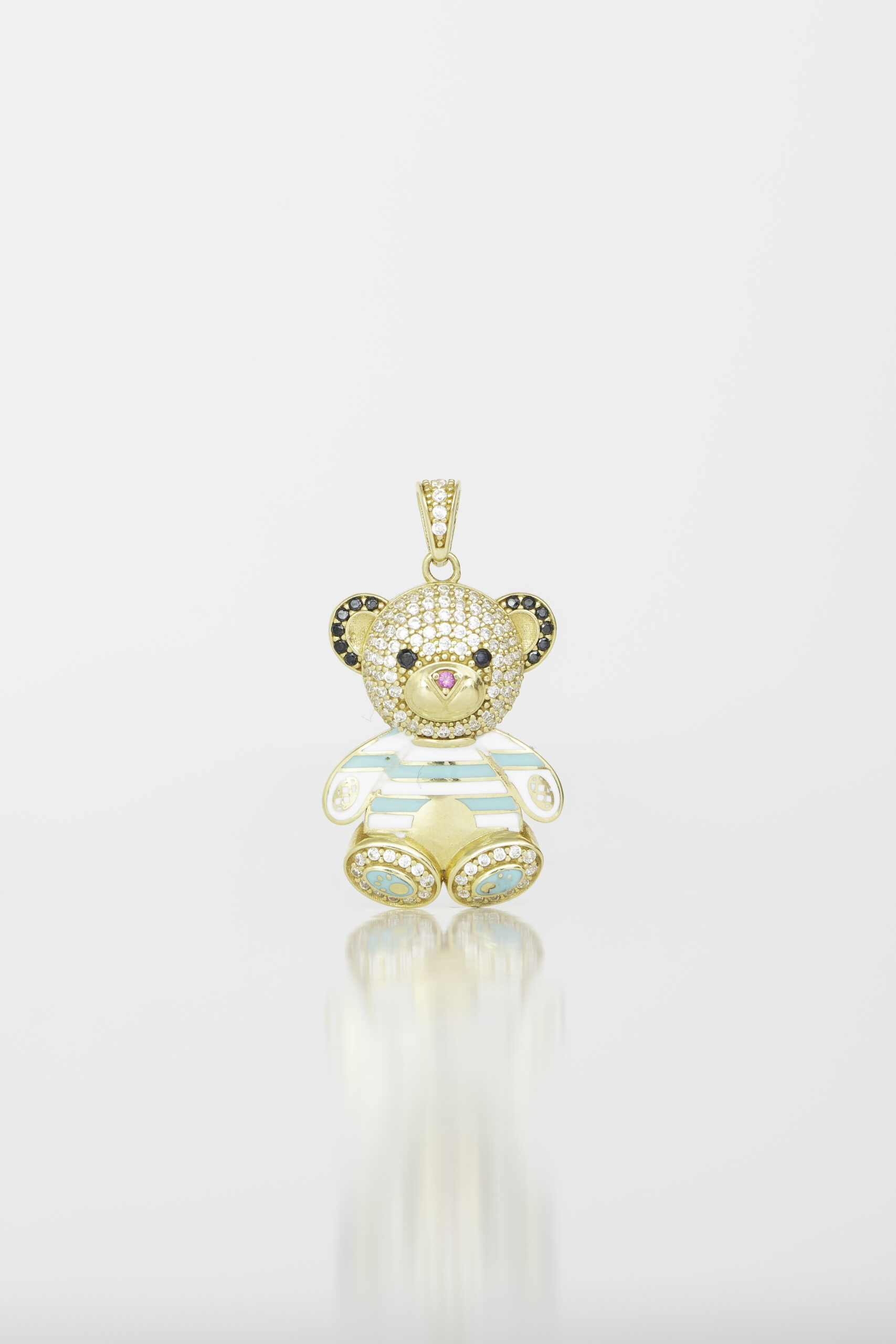 Este encantador dije de osito, elaborado en lujoso oro italiano, fusiona la ternura del diseño infantil con el brillo sofisticado de circones finamente engastados. Su carita resalta con un circón rojo que le da vida y personalidad, mientras que su cuerpo luce un atuendo esmaltado a rayas en tonos turquesa y blanco que le aporta un toque juguetón y único. Ideal para quienes buscan un accesorio con alma alegre, perfecto para regalar o consentirse.