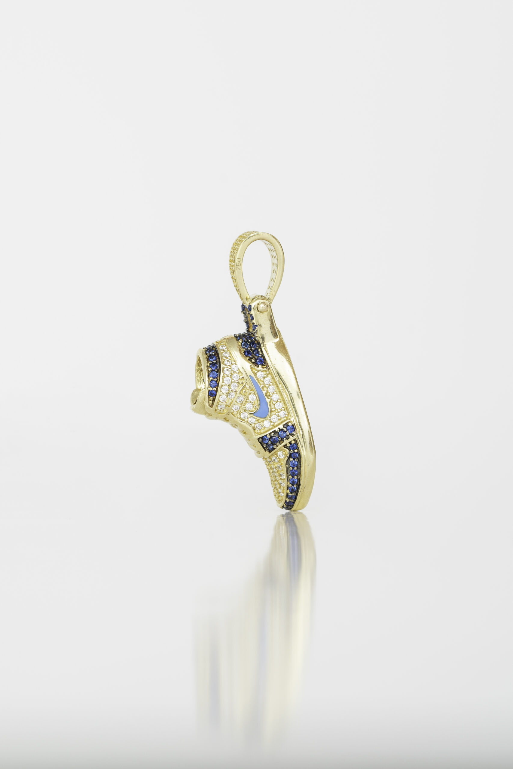Este original dije con forma de zapatilla tipo sneaker está elaborado en fino oro italiano, destacando por su diseño detallado y moderno. Está engastado con circones en tonos blanco y azul, aportando un brillo inigualable que refleja lujo y estilo callejero. Ideal para quienes aman la moda urbana sin renunciar a la exclusividad. Una joya que fusiona elegancia y actitud deportiva en una sola pieza.