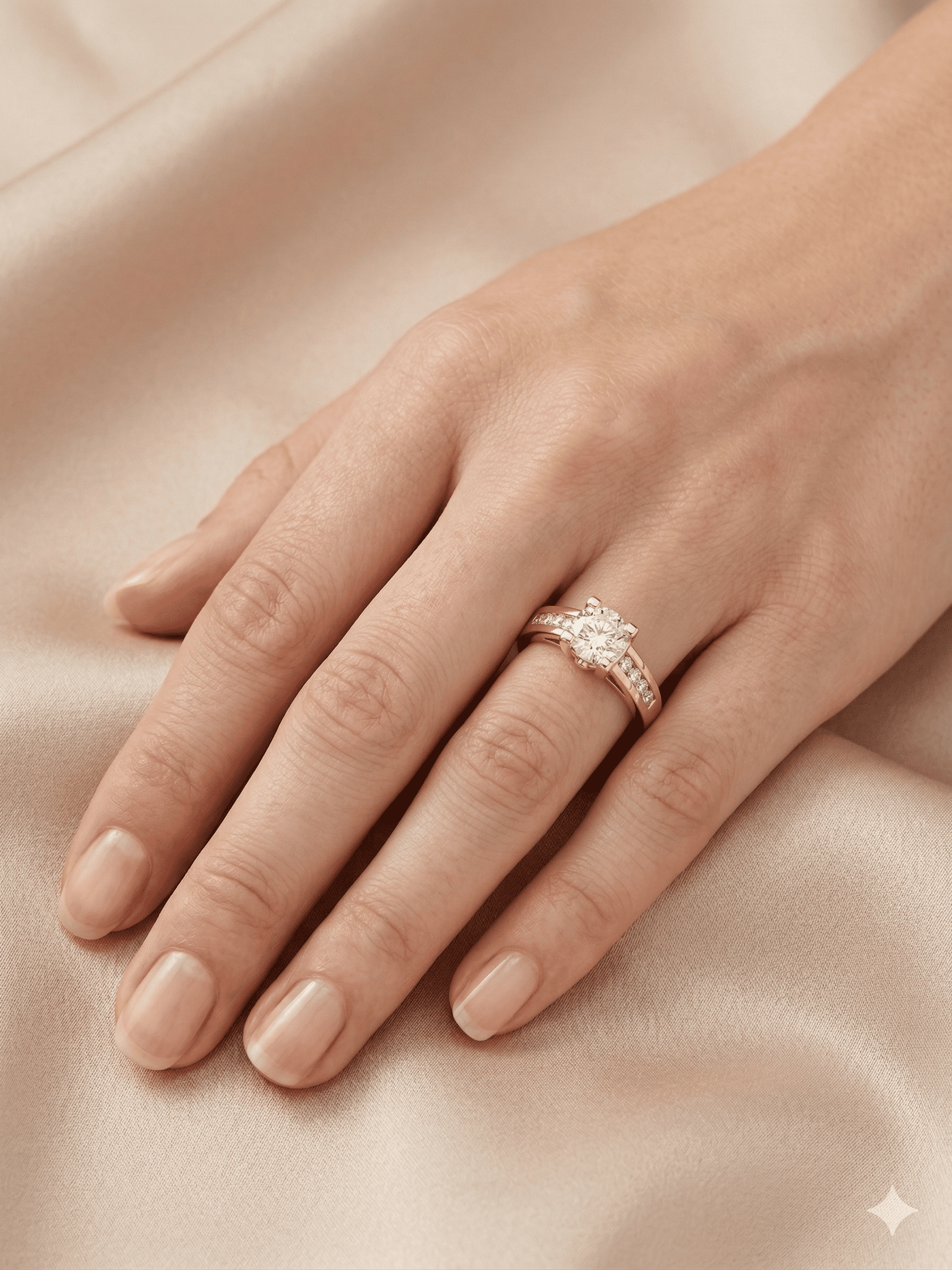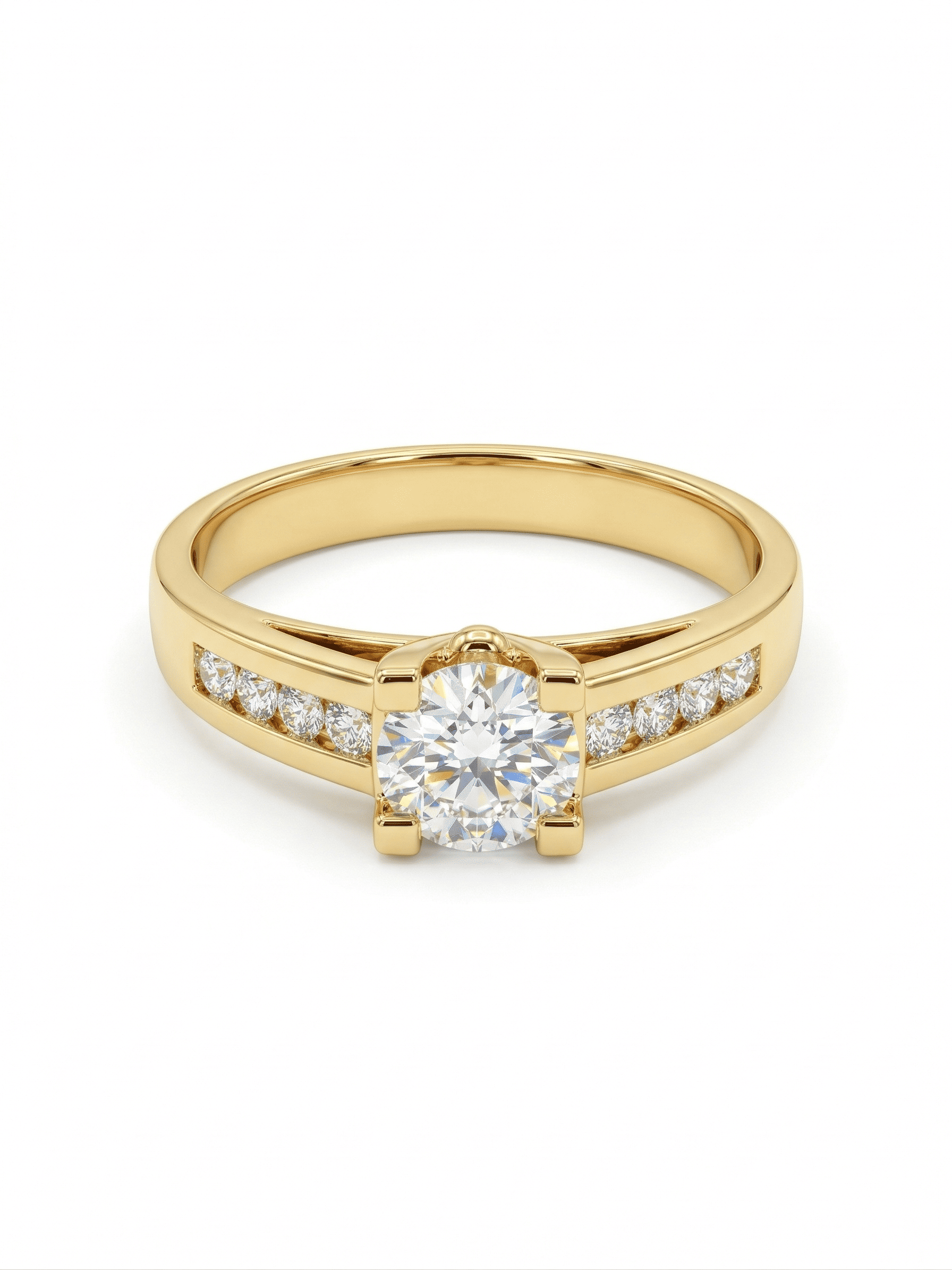 Símbolo eterno de elegancia. Un deslumbrante diamante central de corte brillante, cobijado por un engaste de garras cuadrado en oro amarillo de 18k. Su belleza se ve amplificada por un sofisticado carril de pavé de diamantes que adorna cada lado de la alianza. Un diseño clásico y sofisticado, perfecto para sellar un amor eterno.