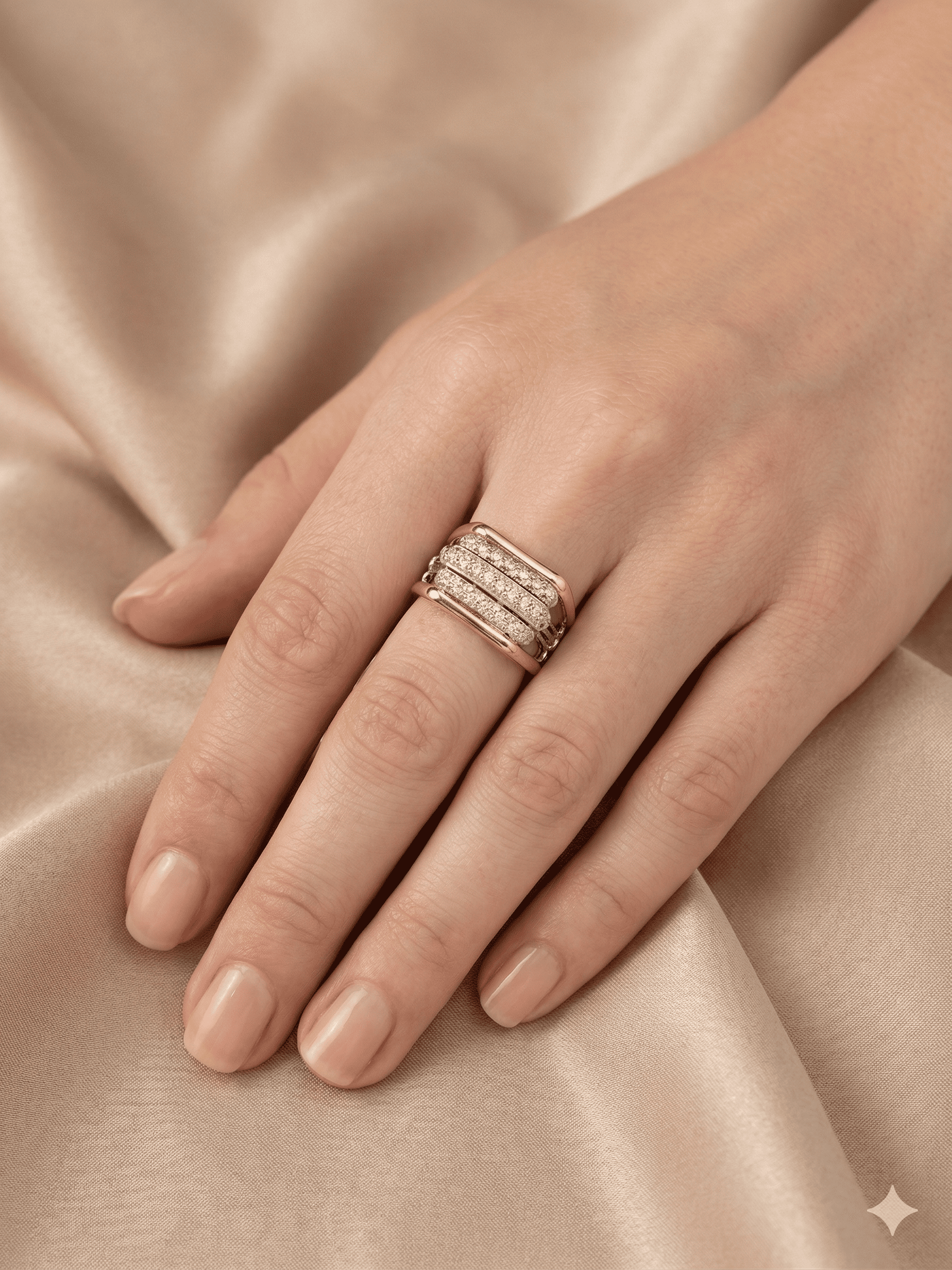 Elegancia en contraste: este anillo de oro 18K combina magistralmente la calidez del oro amarillo con la pureza del oro blanco y el destello de tres hileras de diamantes. Una pieza moderna y sofisticada, diseñada para capturar la luz y resaltar la distinción de quien lo luce.