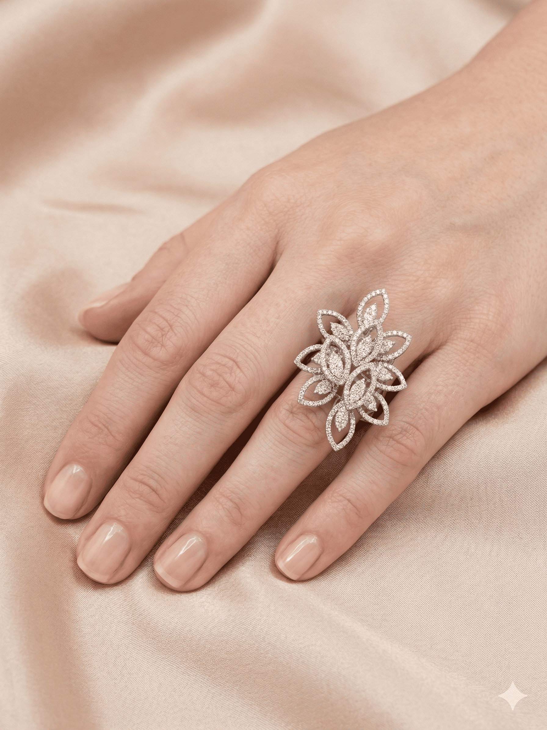 La Magia de un Jardín de Diamantes Elegancia orgánica y brillo infinito. Este anillo tipo bouquet combina la delicadeza de la naturaleza con la fuerza del oro blanco y los diamantes. Una pieza eterna diseñada para brillar en tus momentos más memorables.