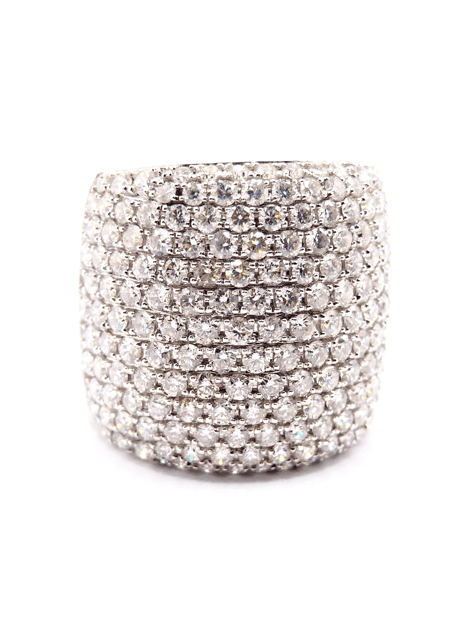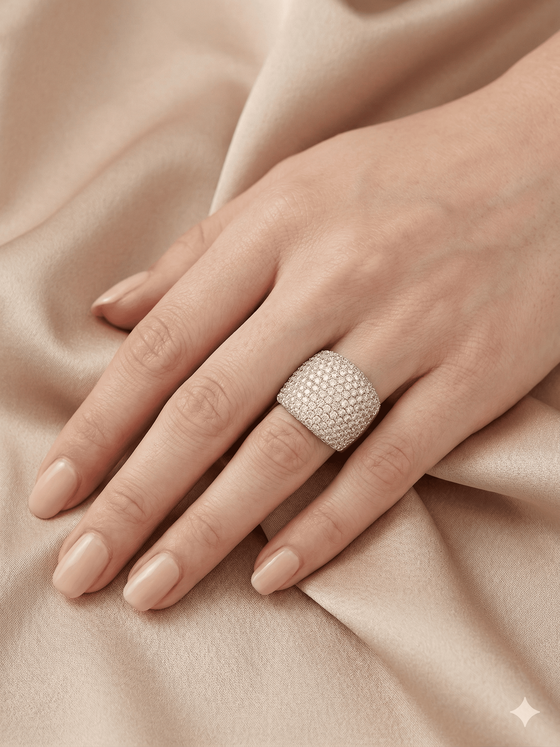 Este imponente anillo de diseño bombé redefine el concepto de lujo contemporáneo. Elaborado con maestría en oro blanco, su estructura ancha sirve como lienzo para un exquisito pavé de diamantes tallados con precisión.