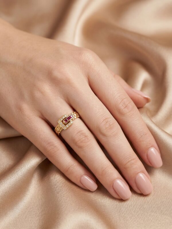 Eleve su colección personal con esta pieza de diseño arquitectónico. Este exclusivo anillo, elaborado en oro amarillo de alta calidad, presenta un sofisticado motivo de hebilla que simboliza la unión y el estilo imperecedero. El diseño se distingue por una hilera de tres rubíes de talla cuadrada en un rojo intenso, enmarcados por un delicado pavé de diamantes brillantes que capturan la luz desde cualquier ángulo. Su banda articulada tipo «eslabón de reloj» aporta una textura única y una comodidad excepcional. Una joya que no solo se usa, sino que cuenta una historia de distinción.