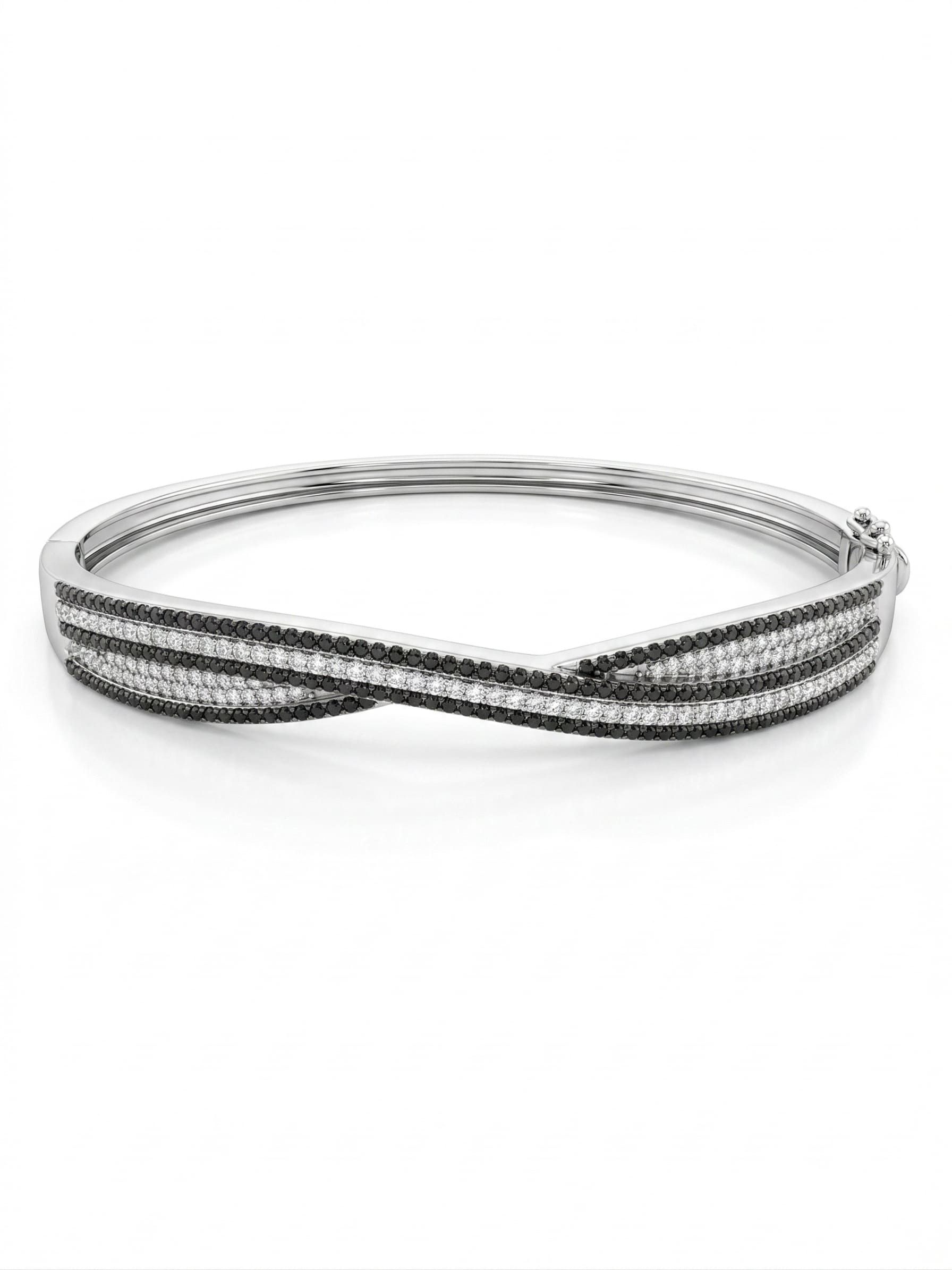 Descubra la sofisticación personificada con este exclusivo brazalete de diseño orgánico, una obra maestra de alta joyería que fusiona la pureza del oro blanco con el misticismo de los diamantes negros y el brillo gélido de los diamantes blancos.