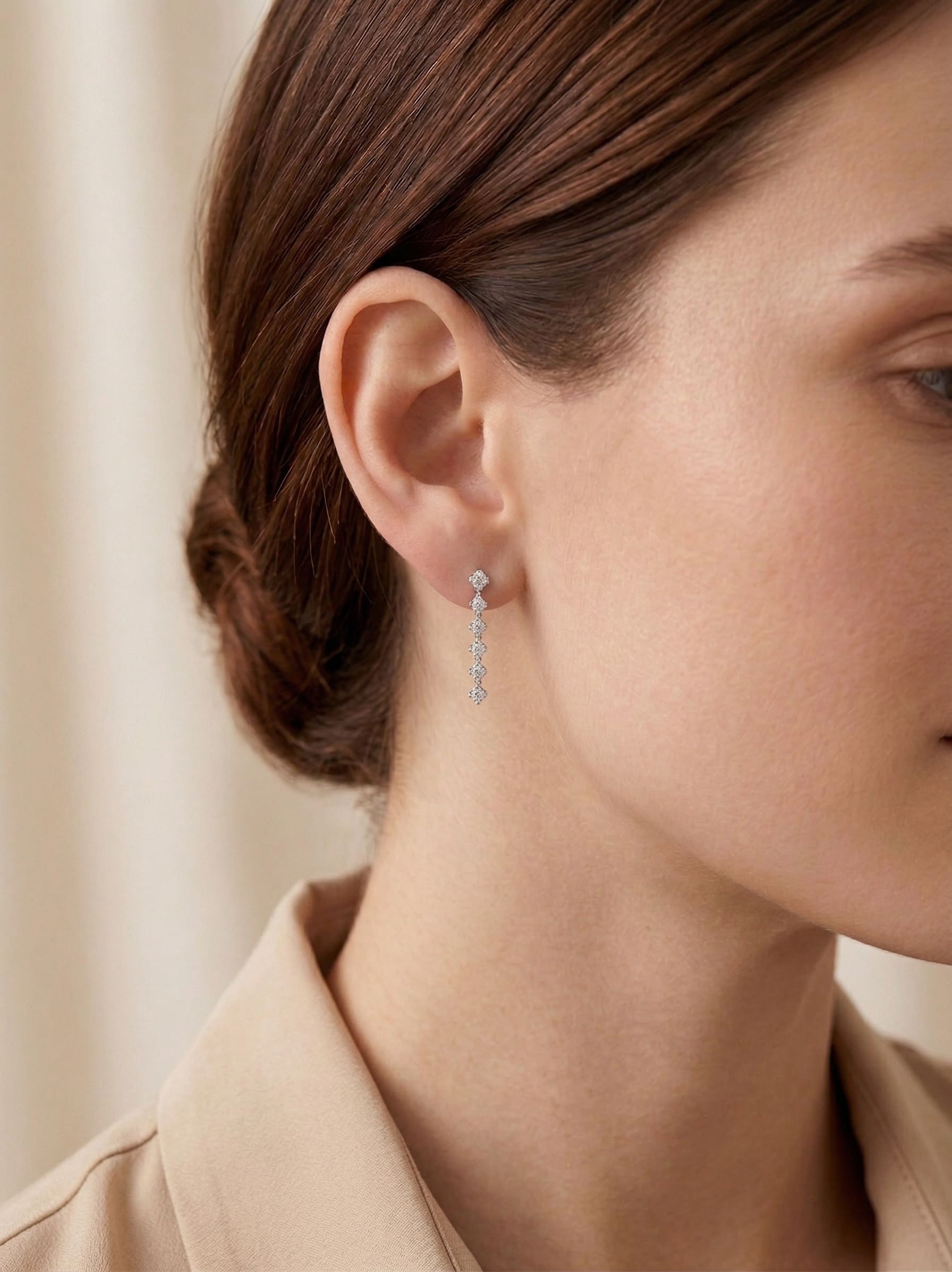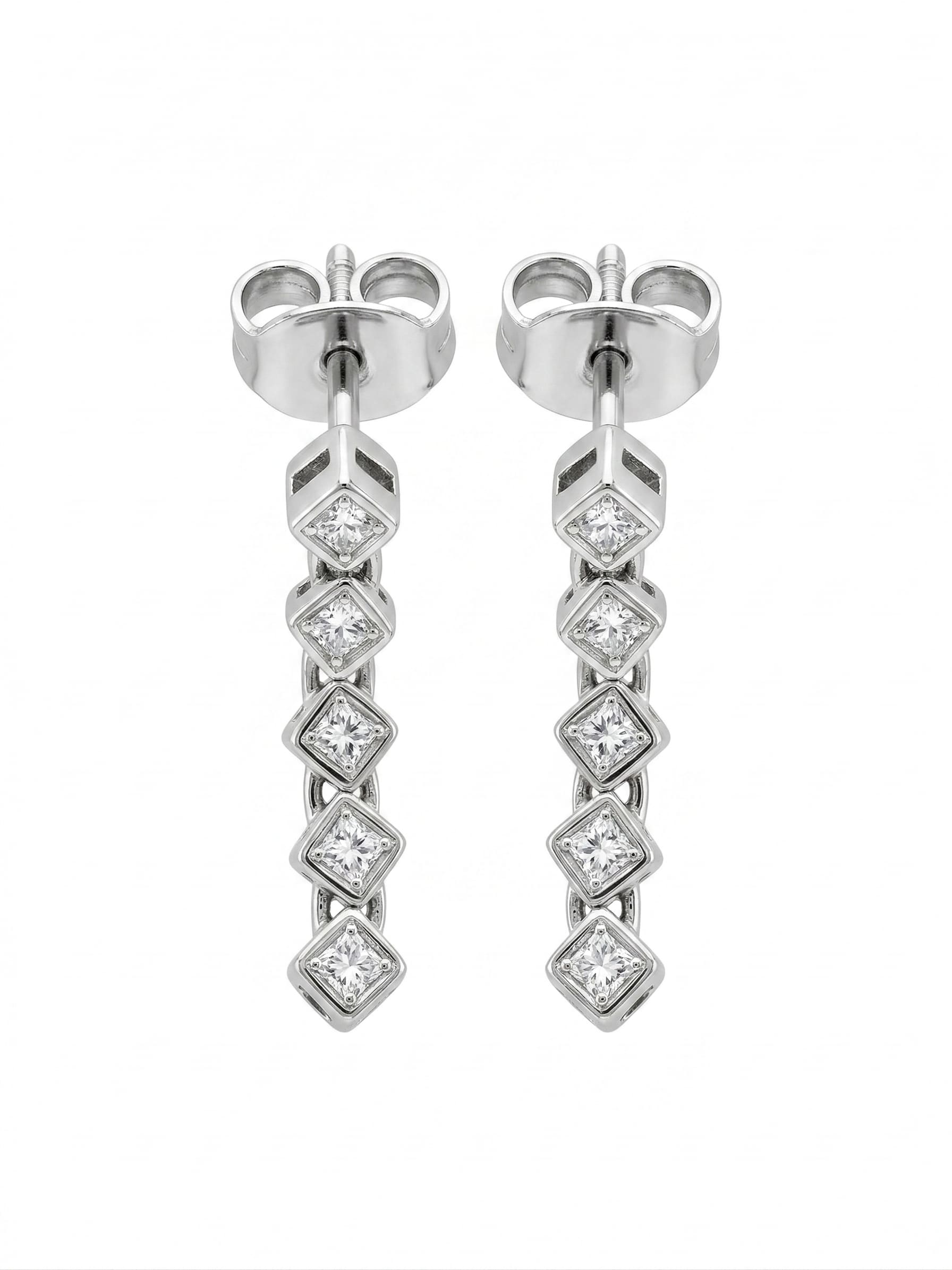 Eleva tu estilo con esta interpretación moderna de la elegancia clásica. Estos exquisitos pendientes, forjados en oro blanco de 18 quilates, presentan una delicada caída vertical compuesta por una secuencia de cinco diamantes de talla princesa, cada uno engastado con precisión artesanal. La disposición en línea de los engastes cuadrados crea una estética minimalista y arquitectónica que captura la luz desde todos los ángulos. Una joya diseñada para la mujer que aprecia la belleza en la simplicidad y el lujo en los pequeños detalles.