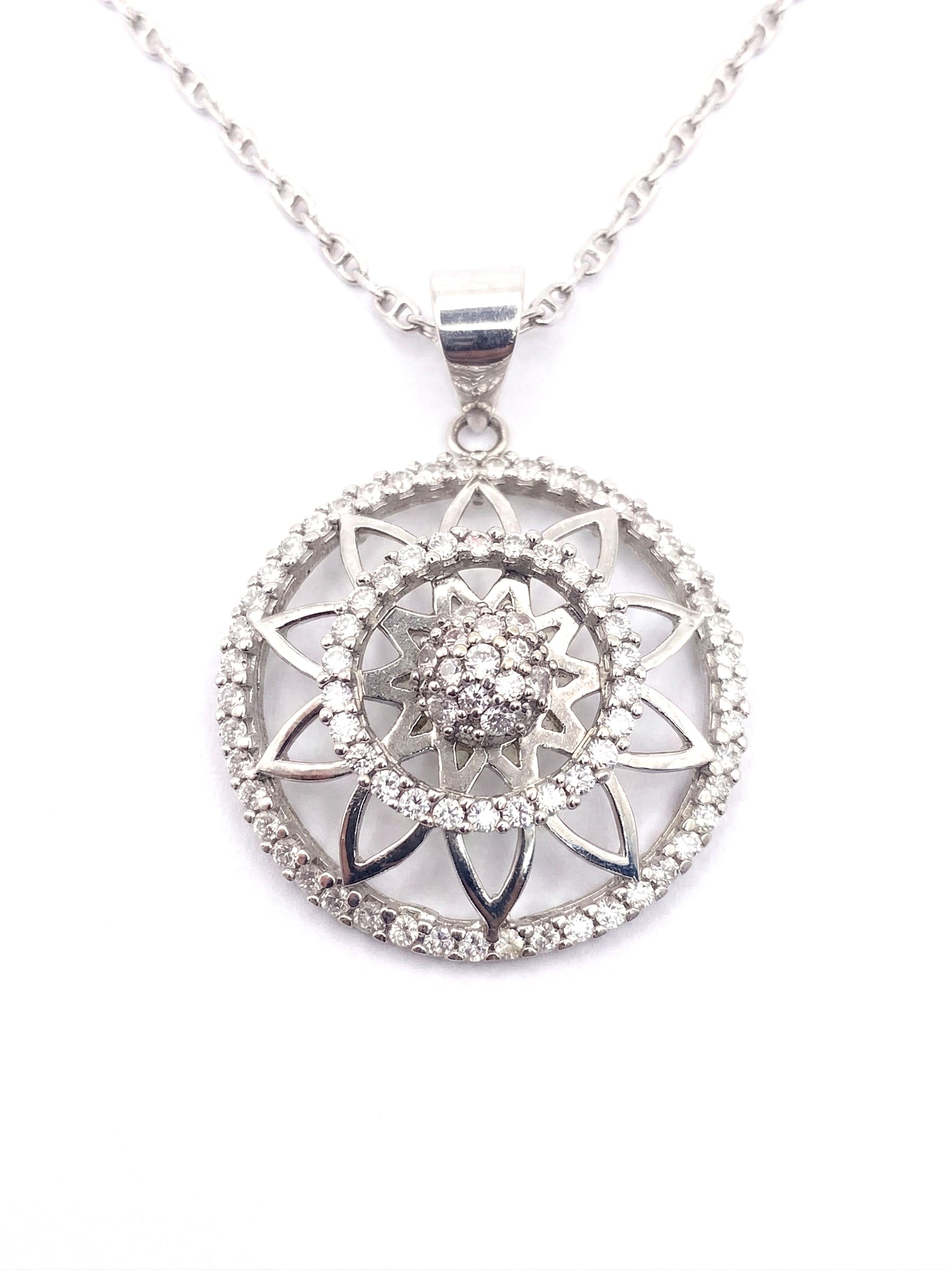 Dije tipo medallón en oro blanco con 86 brillantes de 2 pts cada uno.
