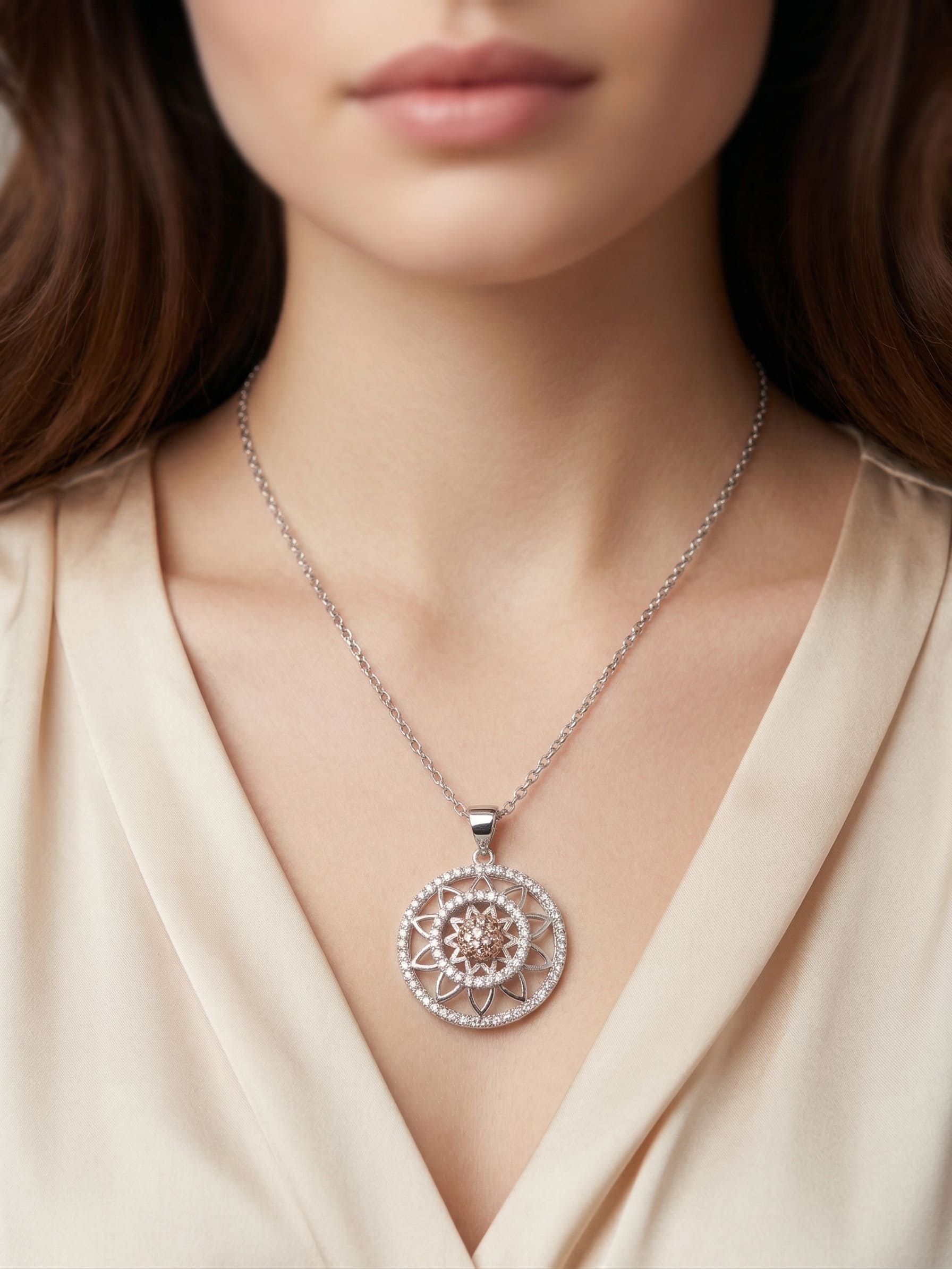 Este exquisito dije es un tributo a la alta joyería y la sofisticación. Diseñado con una estructura concéntrica que evoca la belleza de una mandala celestial, la pieza ha sido meticulosamente forjada en oro blanco de 18 quilates, proporcionando un brillo frío y elegante que sirve como el lienzo perfecto para su deslumbrante pedrería.
