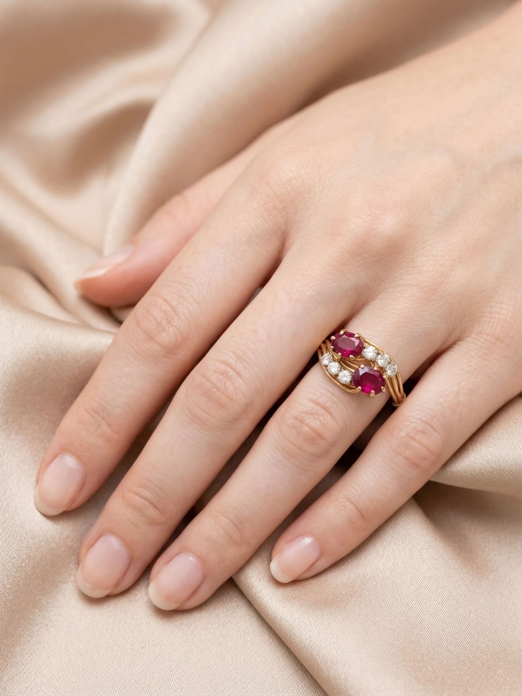 Descubra la armonía perfecta entre el color y la luz. Este anillo presenta una montura de oro amarillo con acabado pulido espejo, destacando dos rubíes naturales de talla ovalada en un elegante engaste bypass. El diseño se completa con una delicada estela de diamantes brillantes que realzan la intensidad de las gemas centrales. Una pieza atemporal que redefine la distinción.