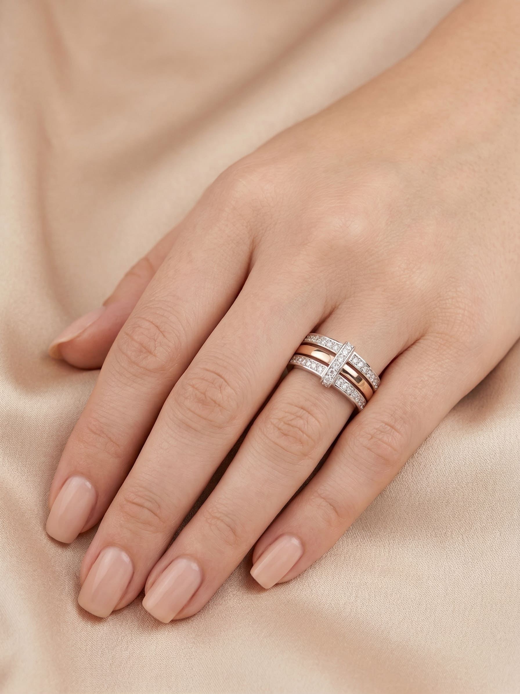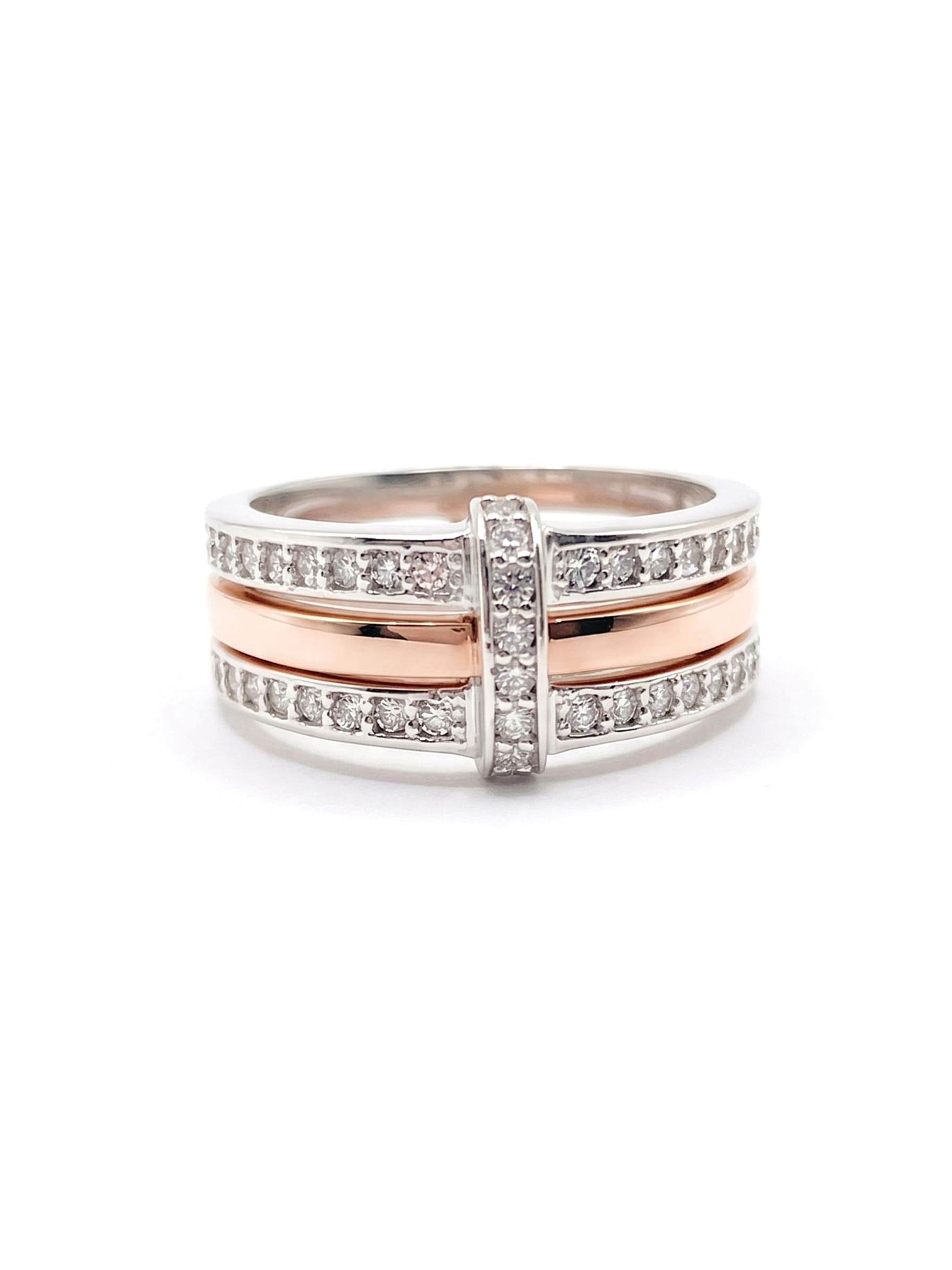 Un sofisticado anillo bicolor de oro blanco y rosa con diamantes. Presenta dos hileras de pavé de diamantes que enmarcan una banda central pulida de oro rosa, y un exclusivo puente vertical de oro blanco adornado con diamantes más grandes en el centro. Es una pieza de diseño moderno y elegante.