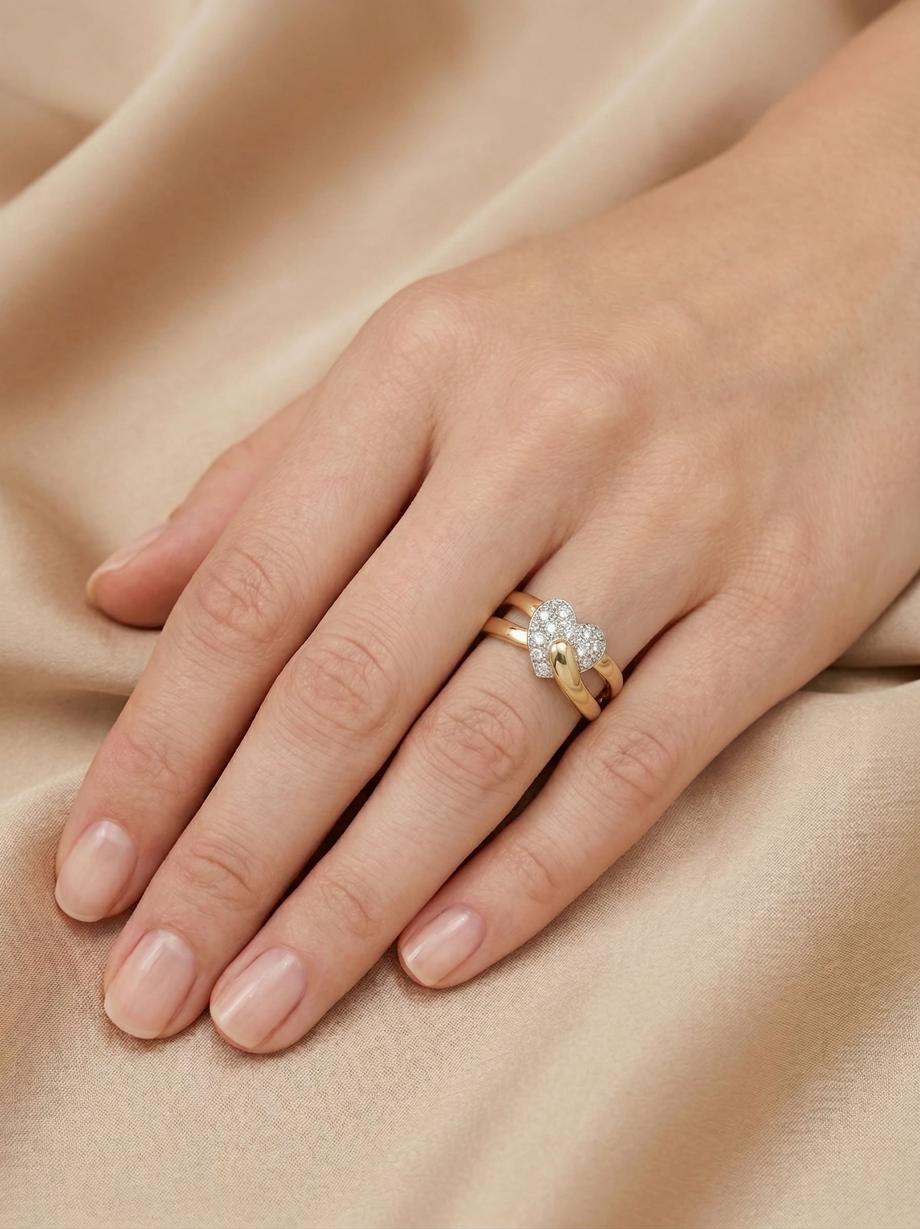 Este refinado anillo destaca por su diseño contemporáneo y romántico, combinando la calidez del oro amarillo con el brillo eterno de los diamantes sobre oro blanco. Elaborado en oro de 18 quilates, presentando un elegante acabado bicolor. Una pieza central en forma de corazón fabricada en oro blanco, que sirve como base para realzar la blancura de las gemas. El corazón está adornado con un pavé de diamantes de talla brillante, seleccionados por su claridad y destello excepcional.