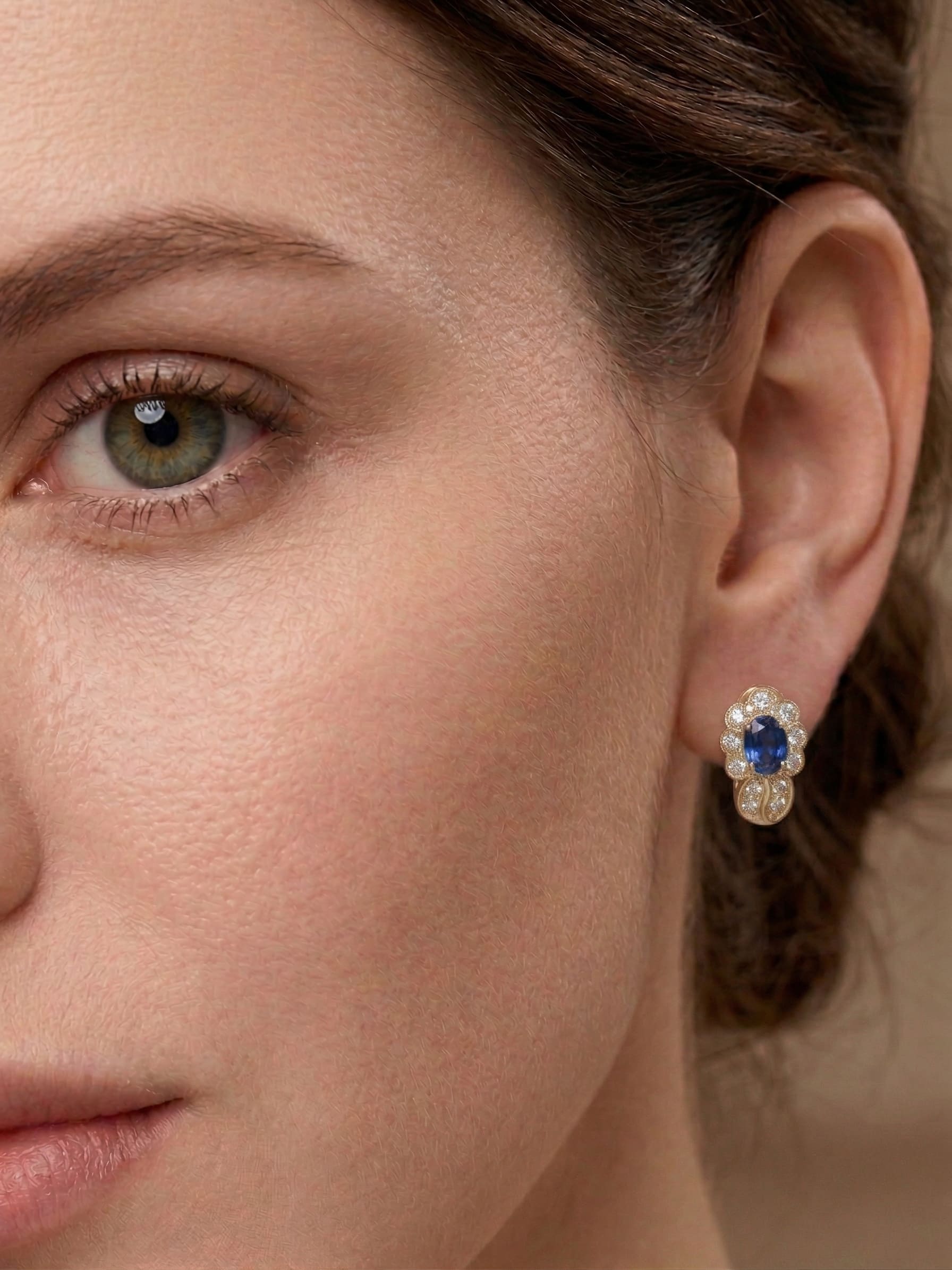 Descubre la sofisticación absoluta con estos exclusivos pendientes elaborados en oro amarillo de 18 quilates. En el corazón de cada pieza reside un zafiro azul profundo de talla ovalada, cuyo color evoca la serenidad de los océanos y el misterio de la noche. Una aureola de diamantes naturales rodea la gema central, meticulosamente engastados para capturar la luz desde cada ángulo.