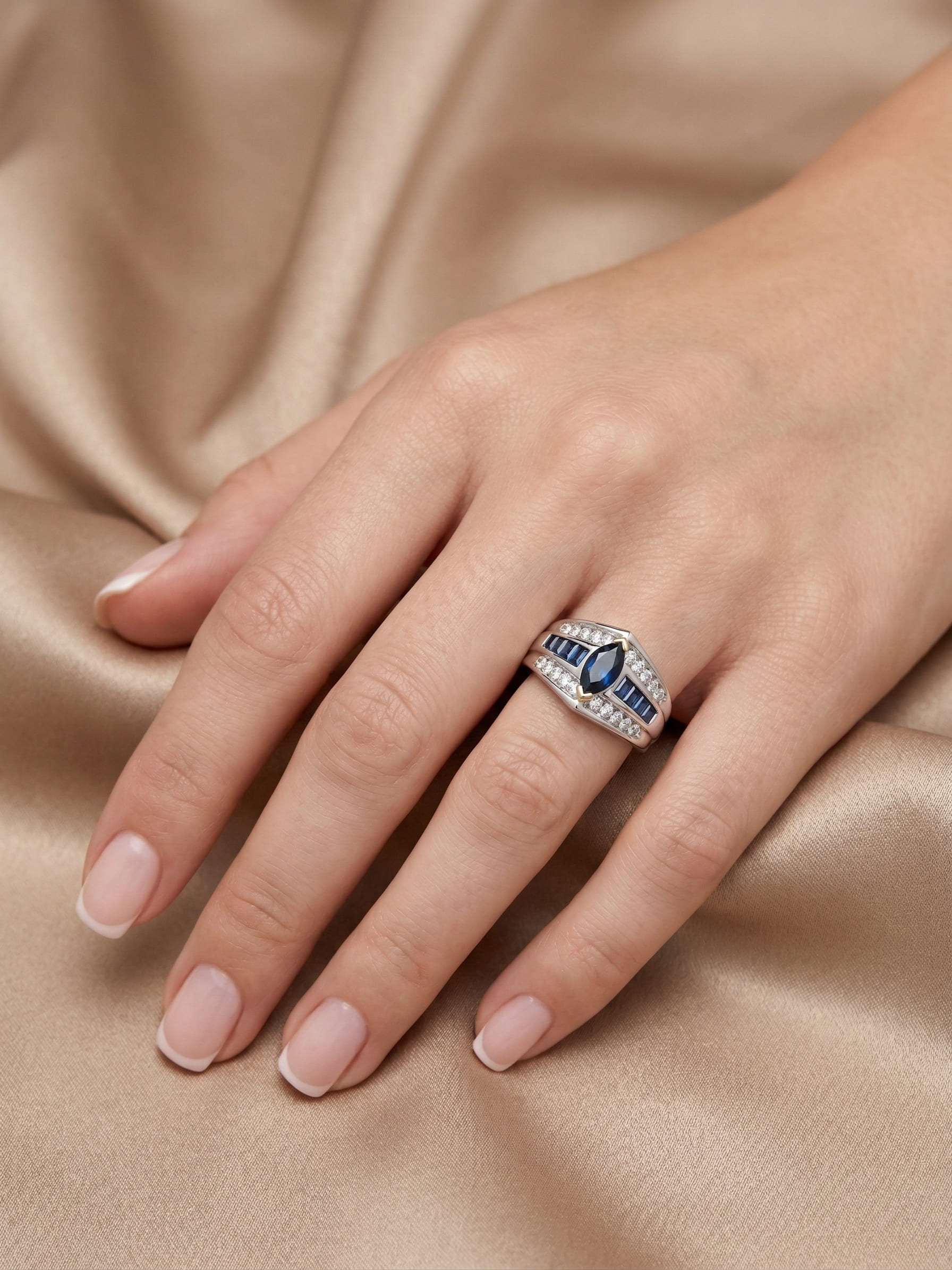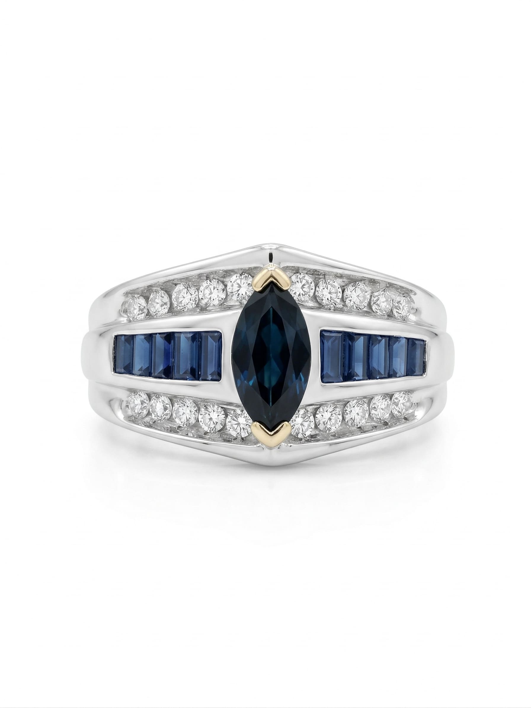 Descubre la armonía perfecta entre el brillo celestial y el azul profundo. Esta exquisita pieza, forjada en oro blanco es una celebración de la simetría y el diseño atemporal. En el corazón de la pieza reside un zafiro central en corte marquisse, cuyo color azul profundo evoca los misterios de la noche. Está flanqueado por una hilera de zafiros en corte baguette que aportan una estructura arquitectónica y moderna, mientras que dos bandas de diamantes naturales de corte brillante añaden un resplandor inigualable a cada movimiento de la mano.
