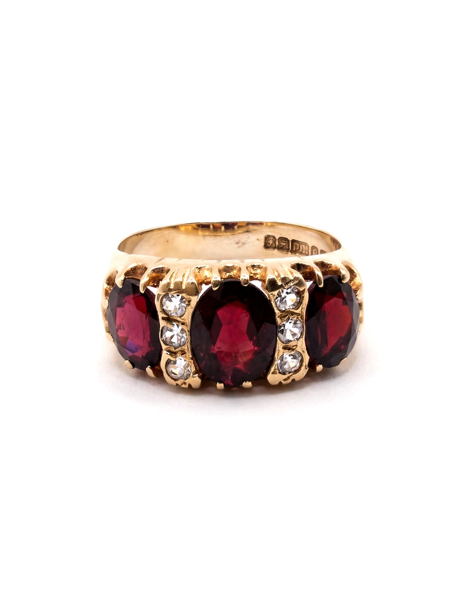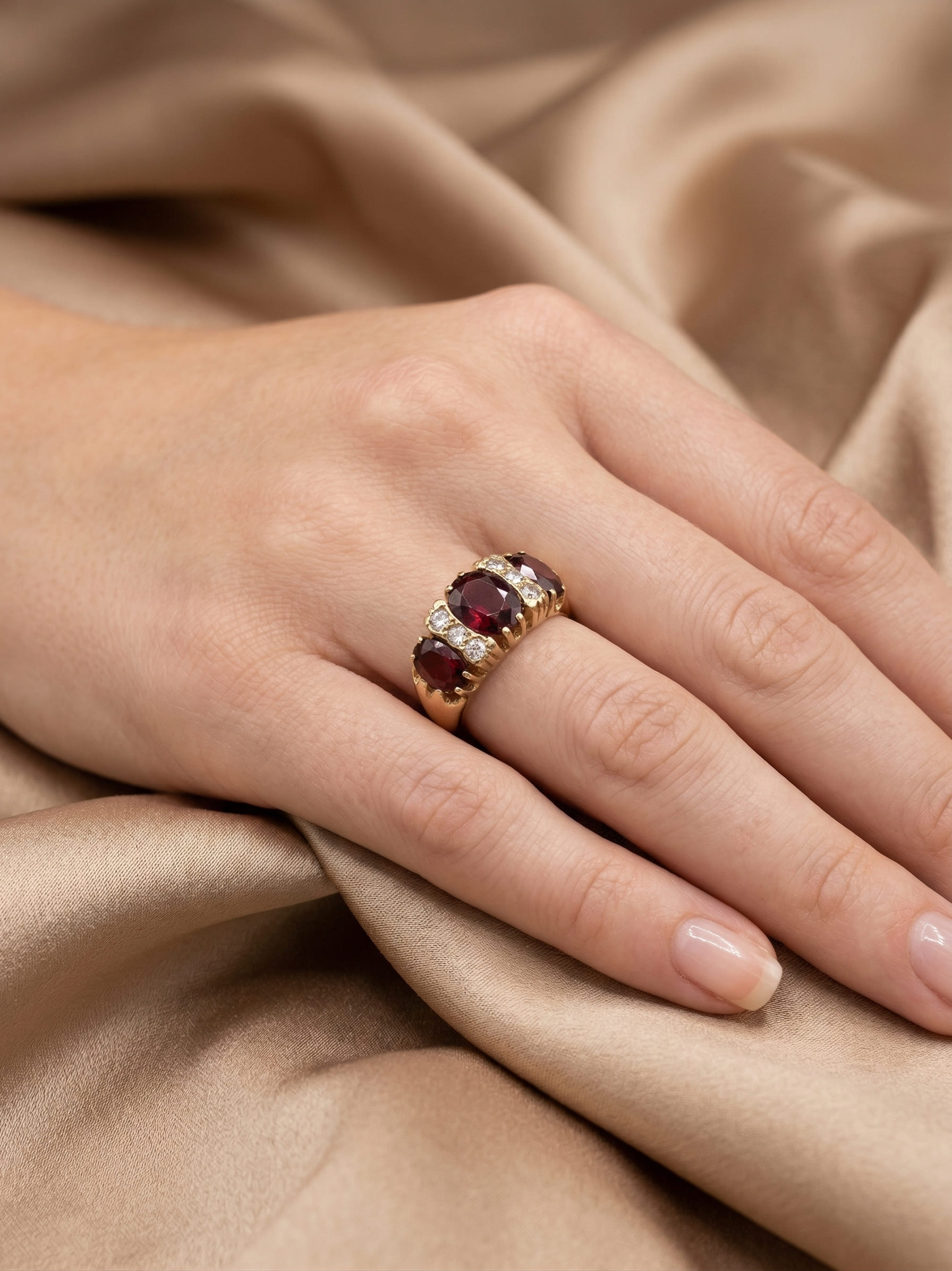 Sumérjase en el lujo absoluto con este exquisito anillo de oro amarillo de 18 quilates. En su centro, tres rubíes de un rojo profundo y aterciopelado capturan la esencia de la elegancia clásica. Entre estas piedras preciosas, una hilera vertical de diamantes finamente engastados añade un contraste de luz deslumbrante. Una pieza de declaración diseñada para quienes aprecian la maestría artesanal y la belleza atemporal.