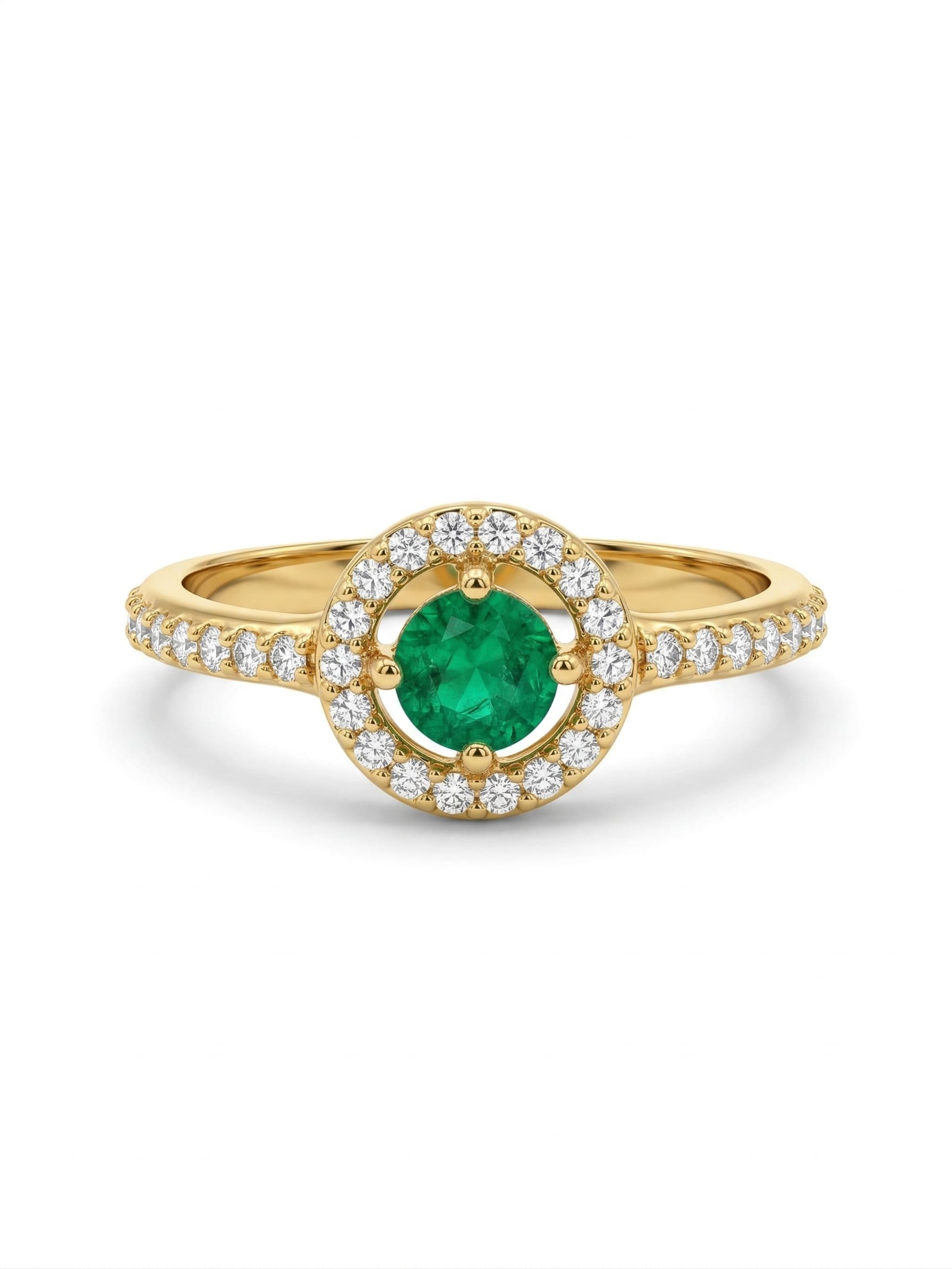 Este exquisito anillo en oro amarillo es una celebración de la elegancia clásica y el diseño contemporáneo. En su corazón, una vibrante esmeralda central cautiva con su verde profundo y natural, rodeada por un delicado halo de circones que potencian su resplandor único.