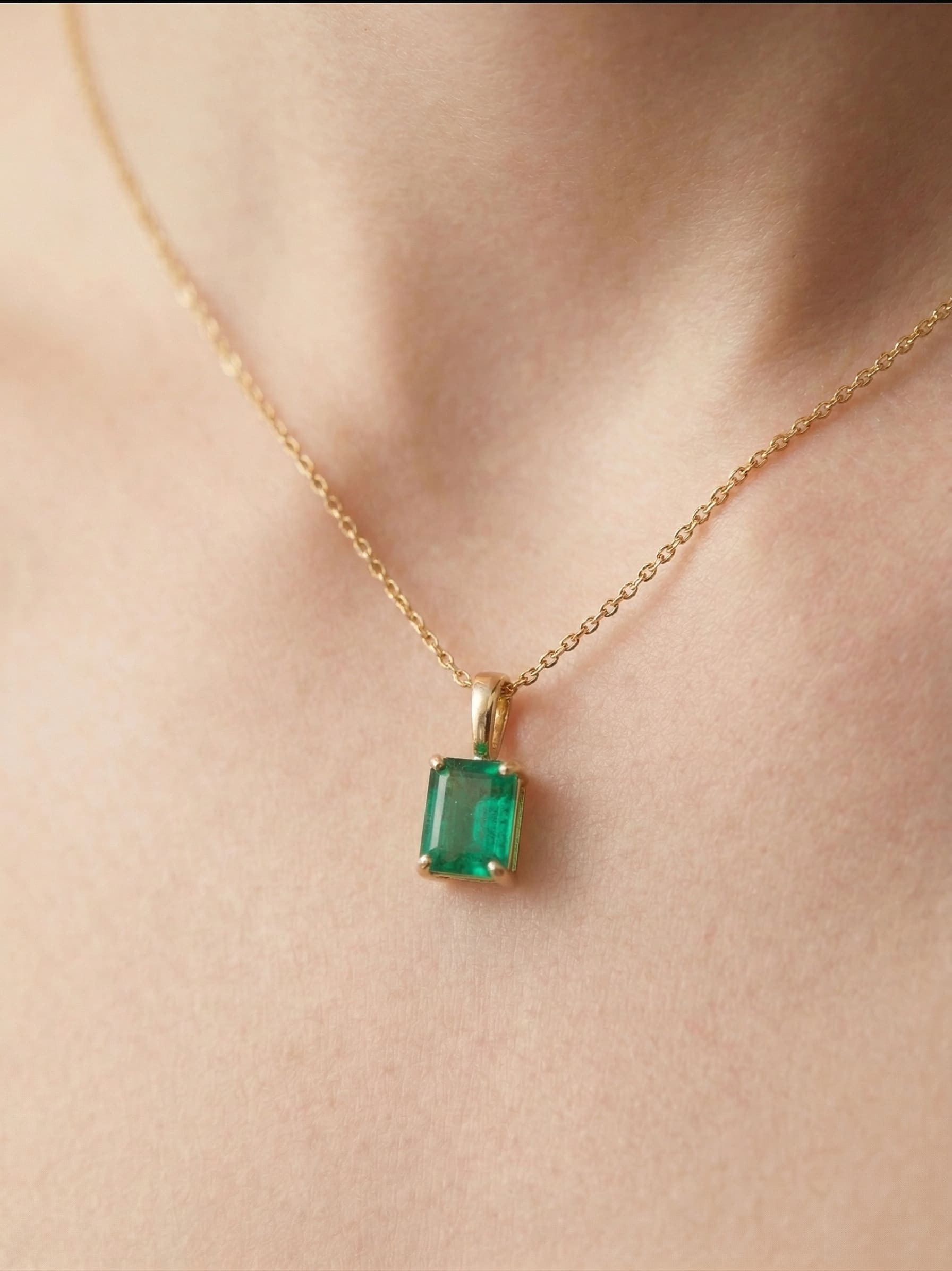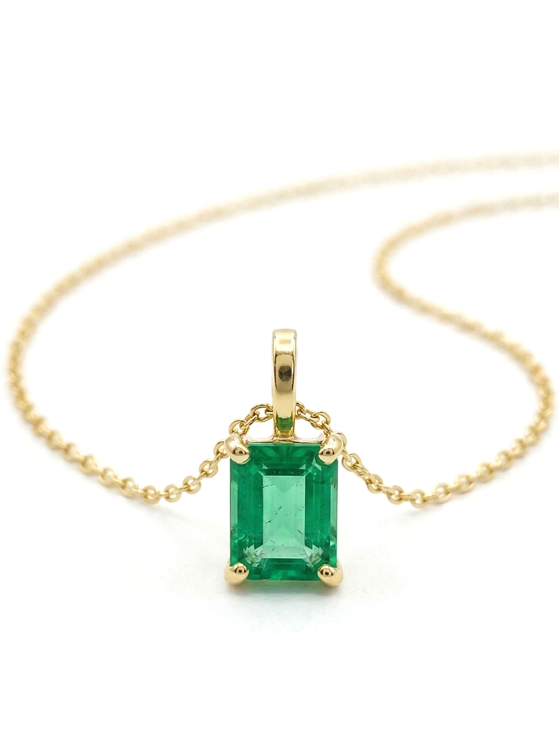 Un destello de naturaleza eterna en tu cuello. Este delicado dije presenta una esmeralda de corte impecable, cuyo verde profundo contrasta magistralmente con la calidez del oro amarillo de 18k. Una pieza minimalista diseñada para capturar la luz y todas las miradas, aportando un toque de lujo sutil a tu día a día.