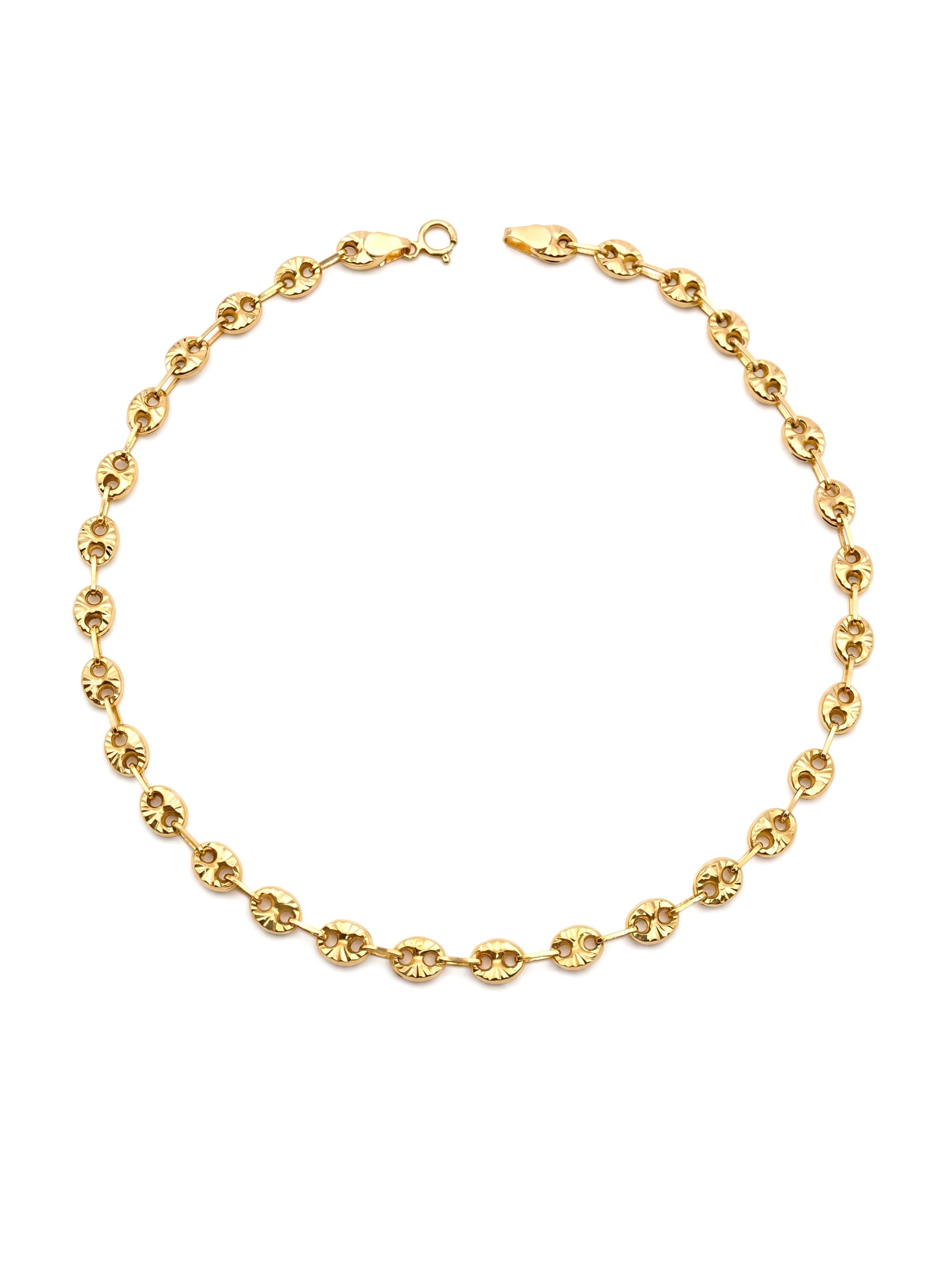 Esta exclusiva tobillera de oro amarillo de 18 quilates presenta un diseño de eslabones grano de café diamantados, elaborados con precisión. Cada detalle grabado capta la luz de manera deslumbrante, ofreciendo un toque de lujo y sofisticación que eleva cualquier atuendo de verano. Un accesorio único y detallado.